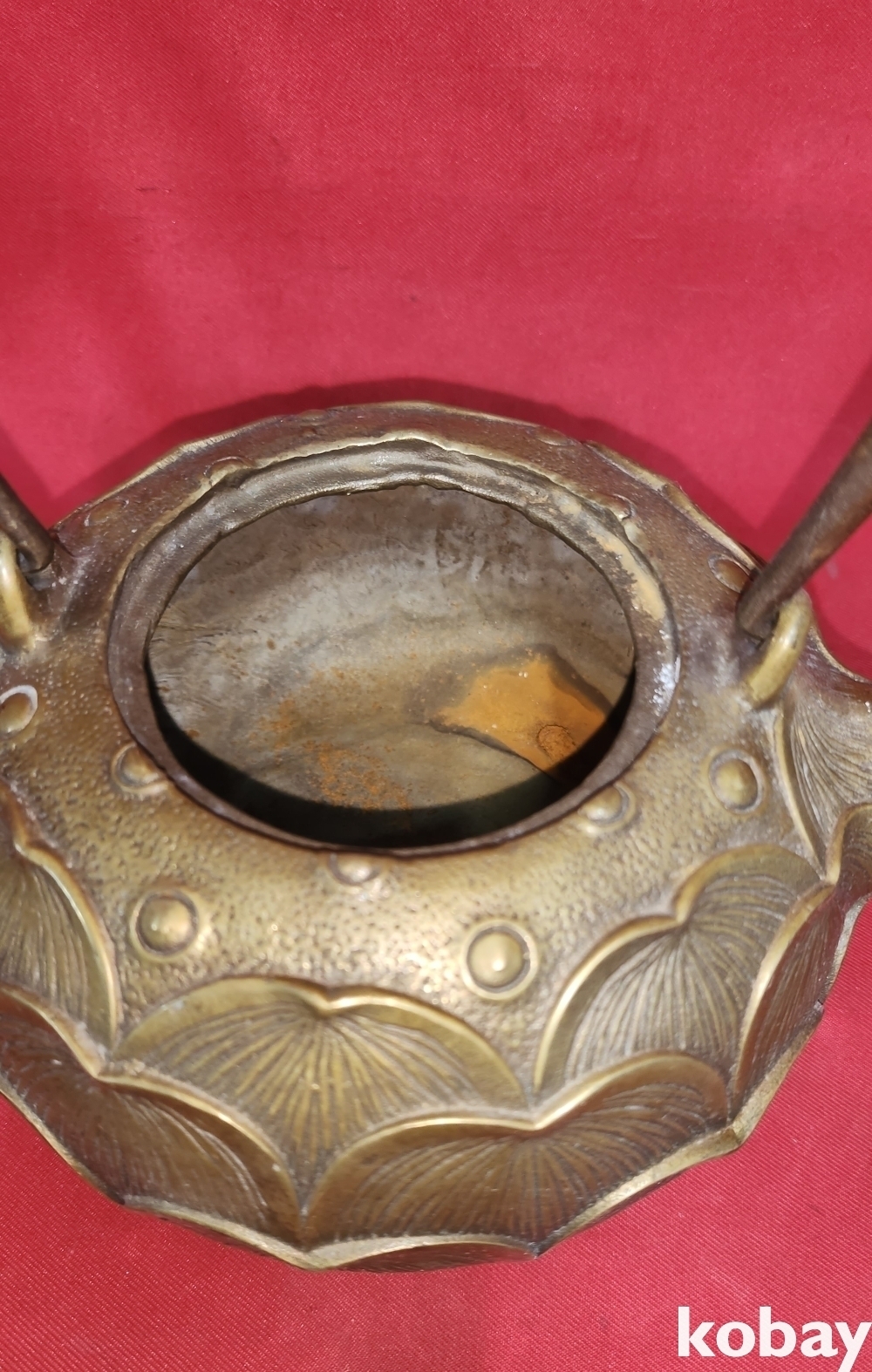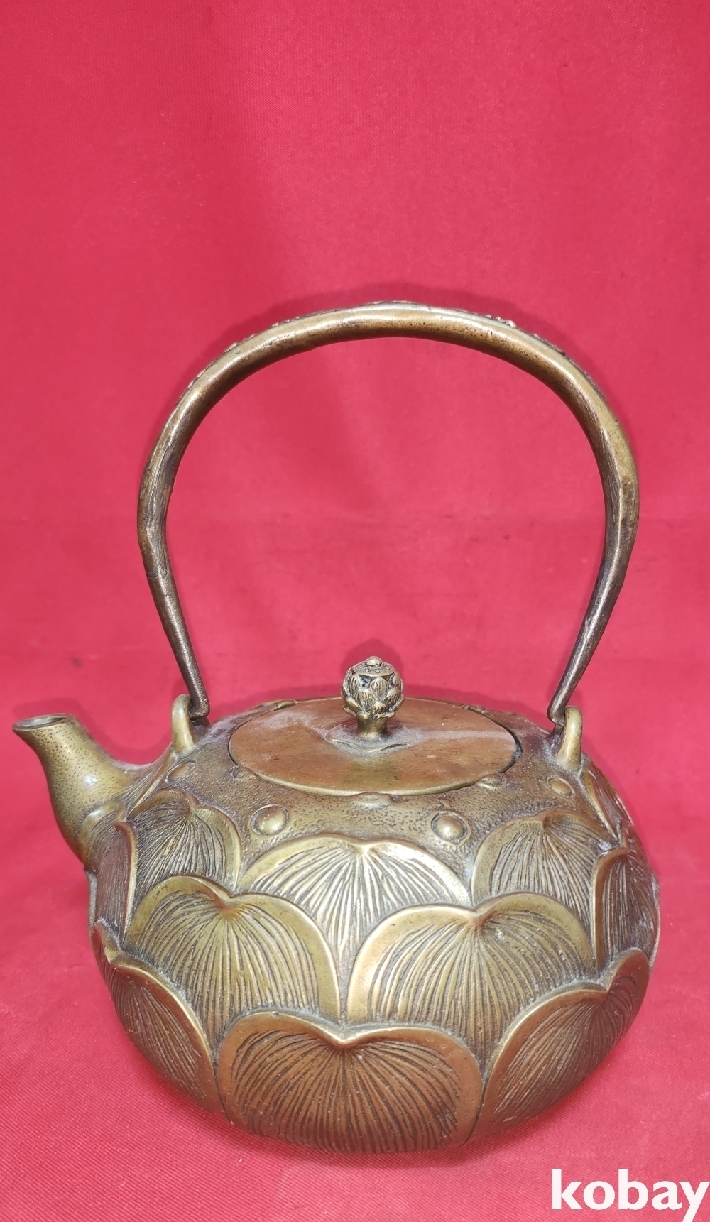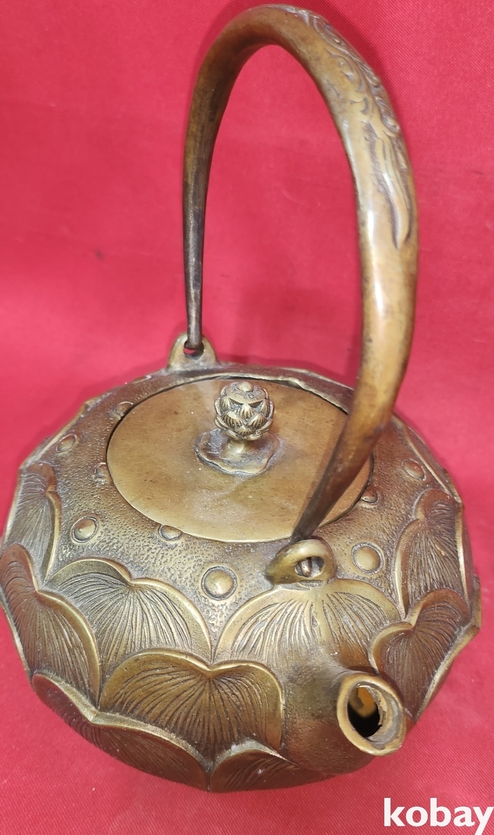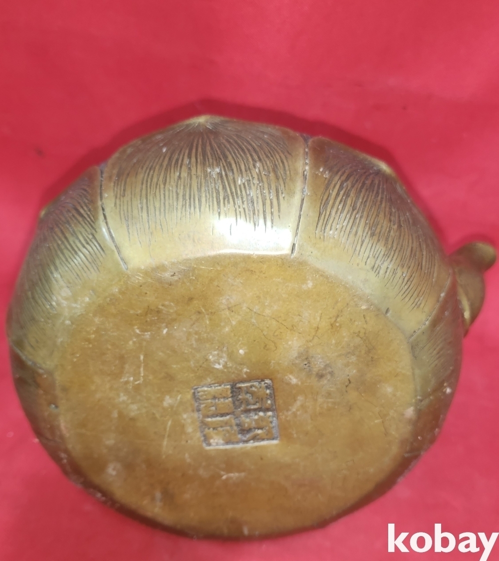 청나라 건륭관지 보이는 청동으로 완성된 연잎괴 연꽃문양 주전자입니다,