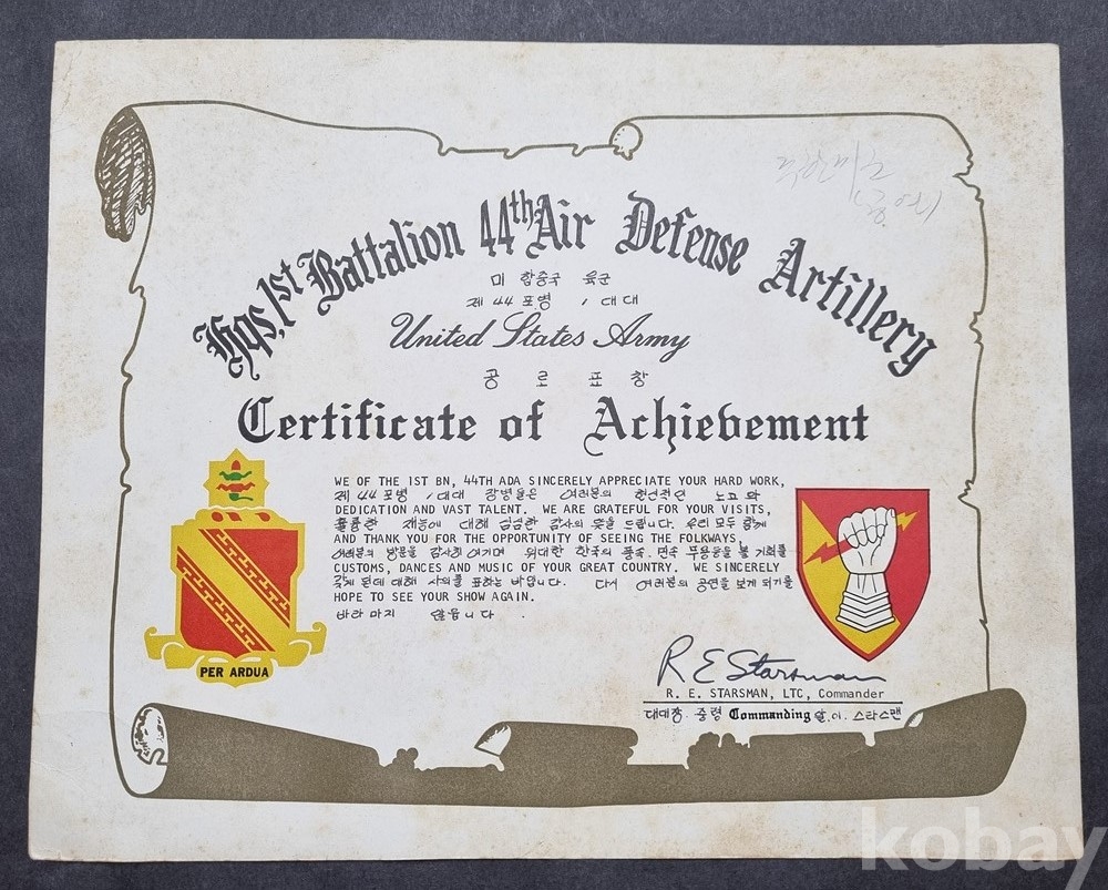 K-5 / 1970년대 후반 주한 미군 부대에서 한국인 협력자나 공연단에게 수여한 공로표창장