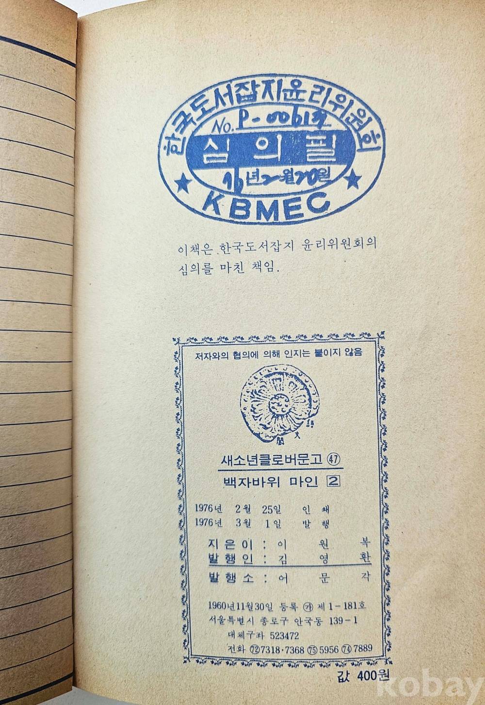 물 품 명 | 백자바위 마인 2편 / 이원복 만화 / 1976년 / 어문각 |