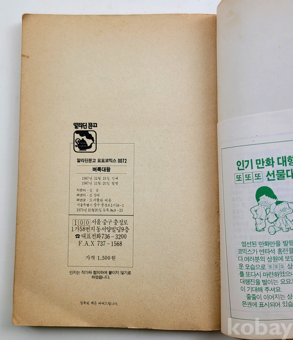 물 품 명 | 김삼 / 벼룩대왕 / 요요코믹스, 알라딘문고(72) / 1987년 초판 / 도서출판 예원 |