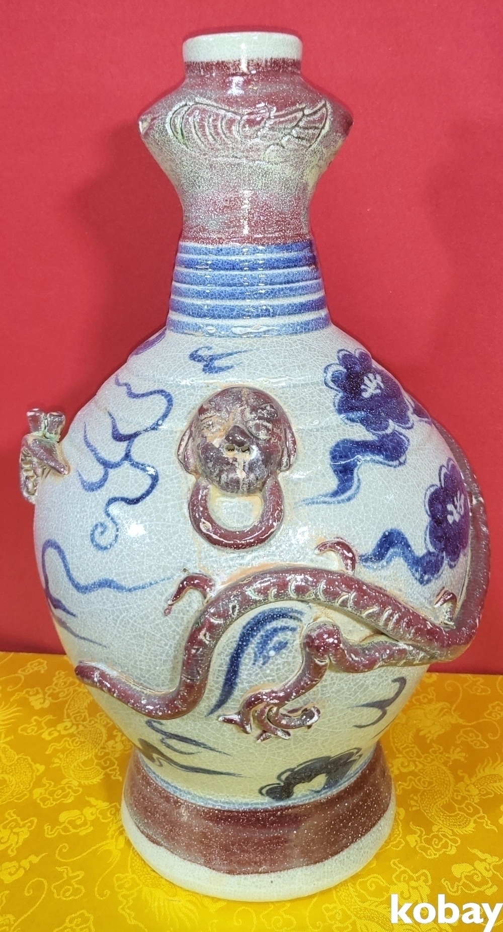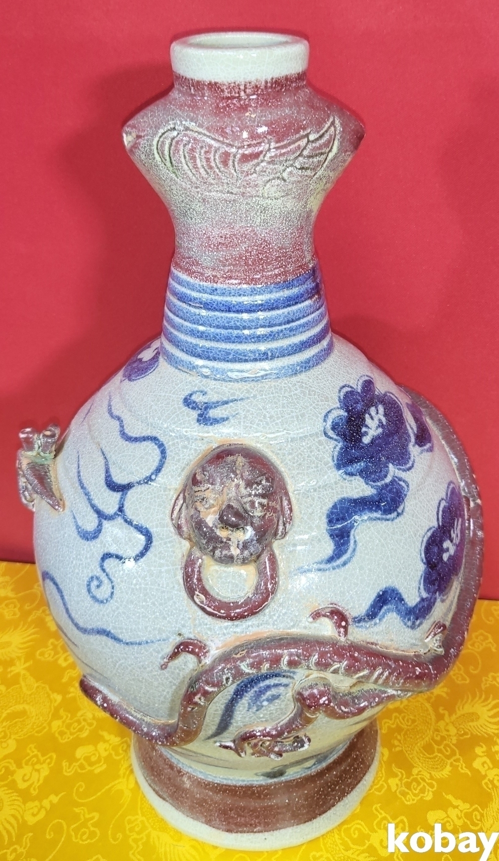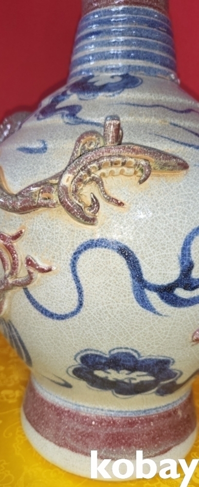 연대 짱짱한 유리홍 첩화 (貼花) 용문양 양이(兩耳) 병입니다,