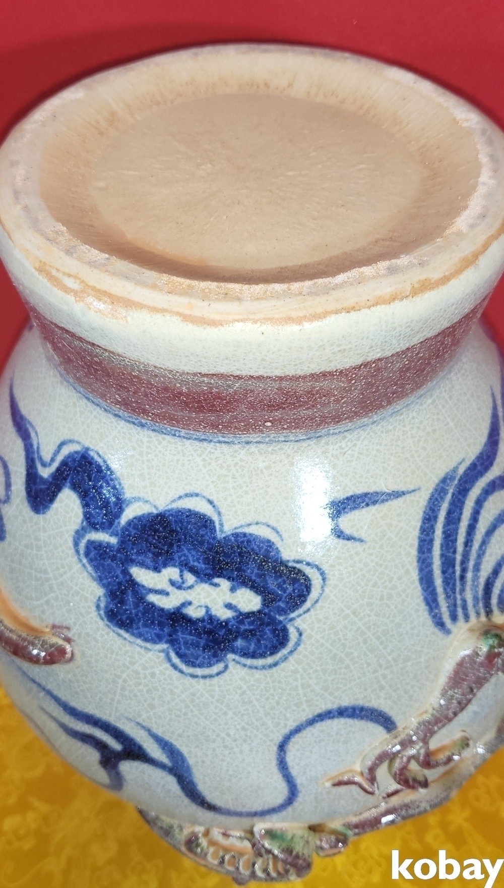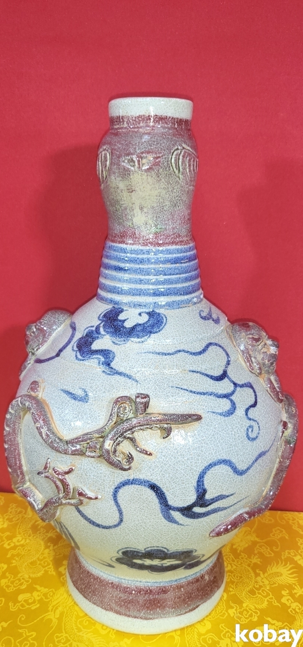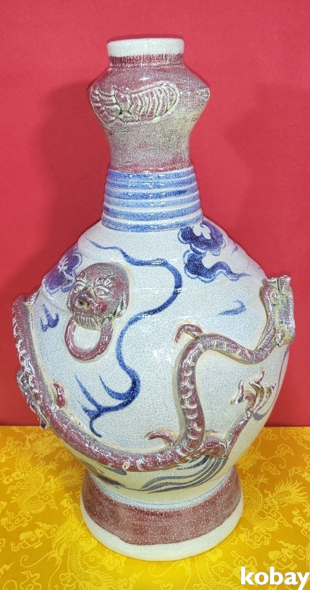 연대 짱짱한 유리홍 첩화 (貼花) 용문양 양이(兩耳) 병입니다,