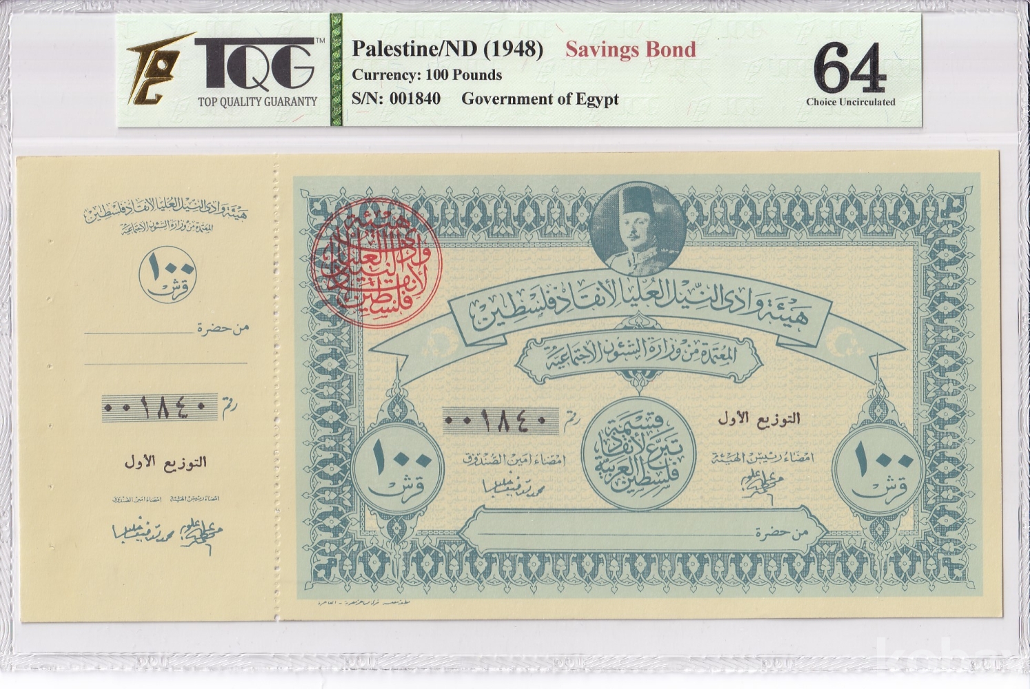 -  이 채권은 1948년 제1차 중동 전쟁(아랍-이스라엘 전쟁) 당시 팔레스타인을 지원하기 위해 이집트 정부에서 발행한 것입니다.
