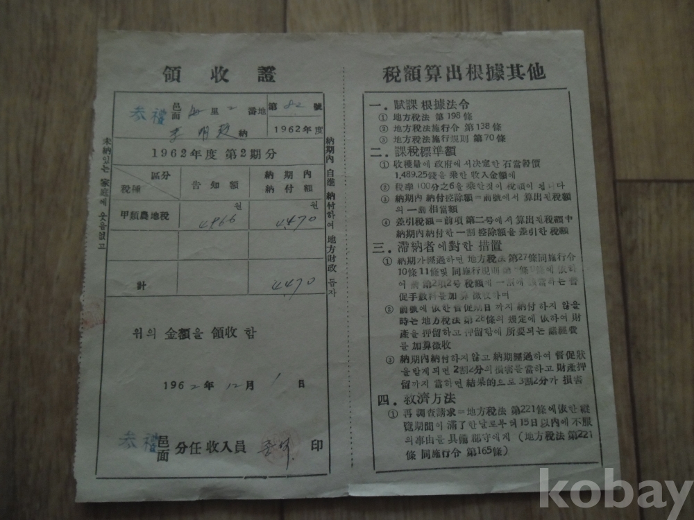 1962년 삼례읍 발행 갑류농지세(영수증)산출근거