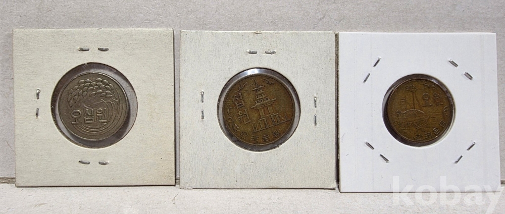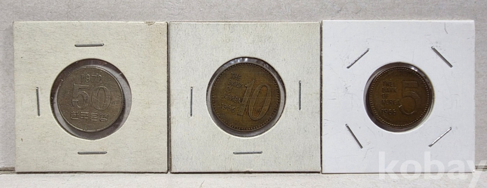 -대한민국 현행주화 1972년 50주, 1966년 10주, 1966년 5주 3종 "초판" 사용제이긴하나 상태좋아 보입니다.