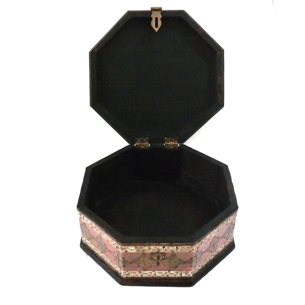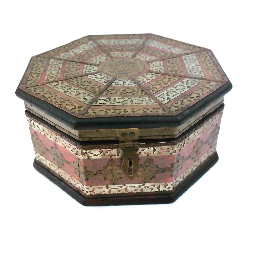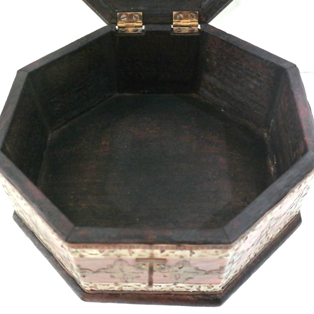 몸통은 나무로 만들어졌으며 표면에는 황동과 백동으로 치장이 되어진 연대미상의 보관함 입니다.