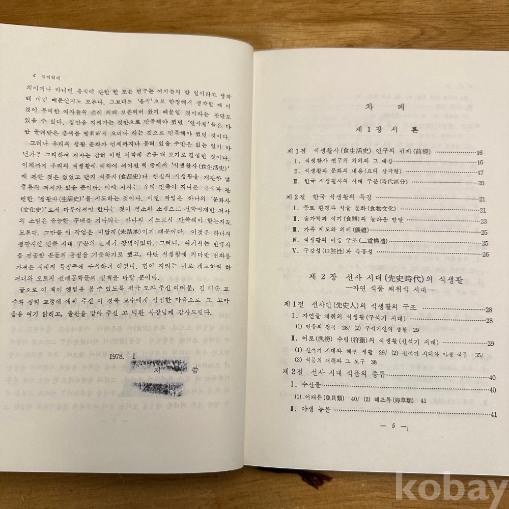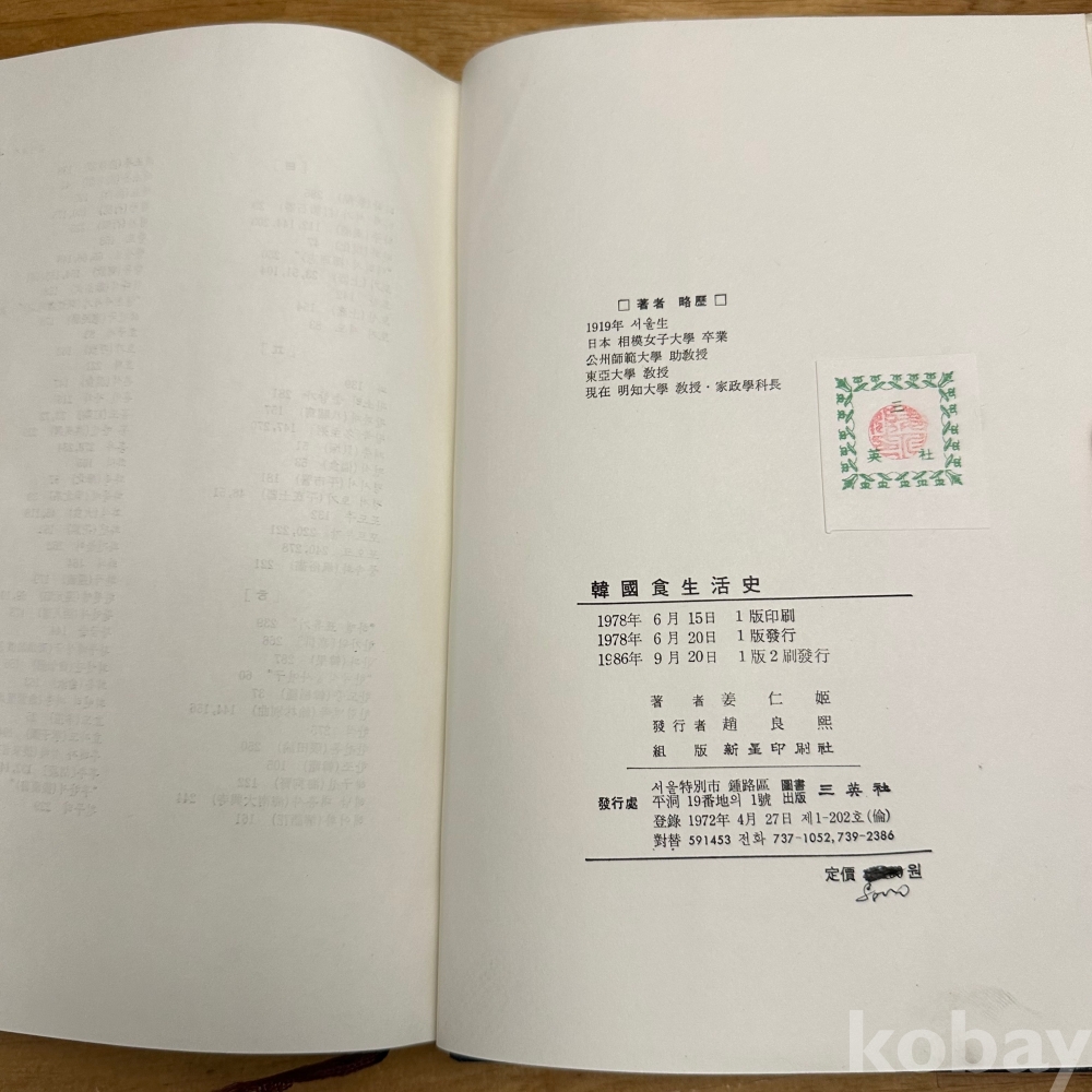 [한국문화사, 식생활, 음식] 강인희, <한국 식생활사>, 삼영사, 1986, p. 305, 상태 중급(사진참조)