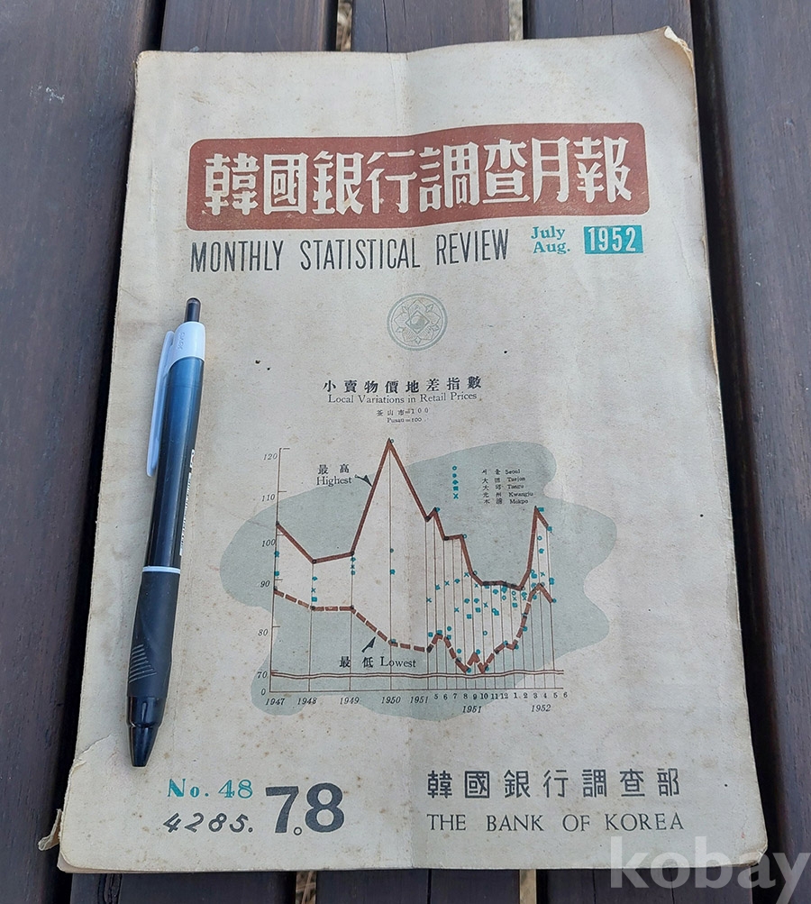 1952년 발행 한국은행 조사월보 7월 8월호 1권 한국전쟁 625동란 부산 금융 잡지