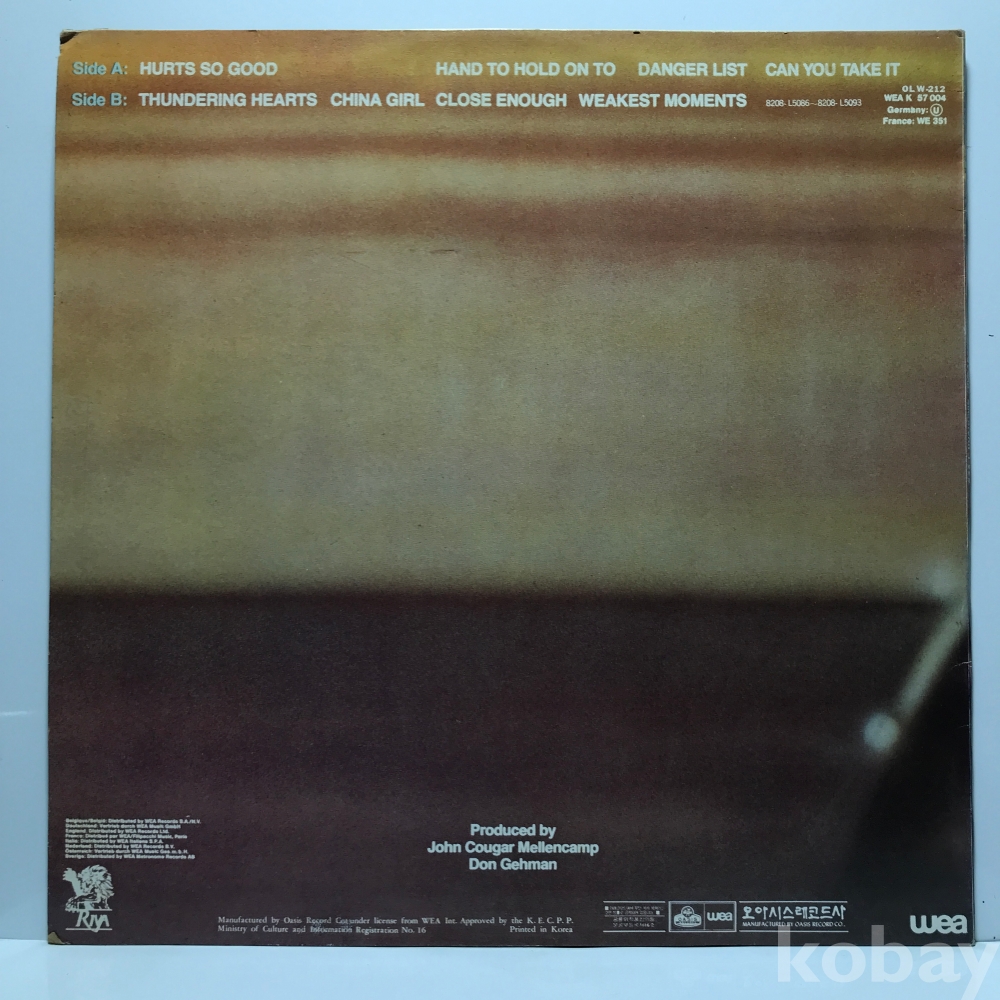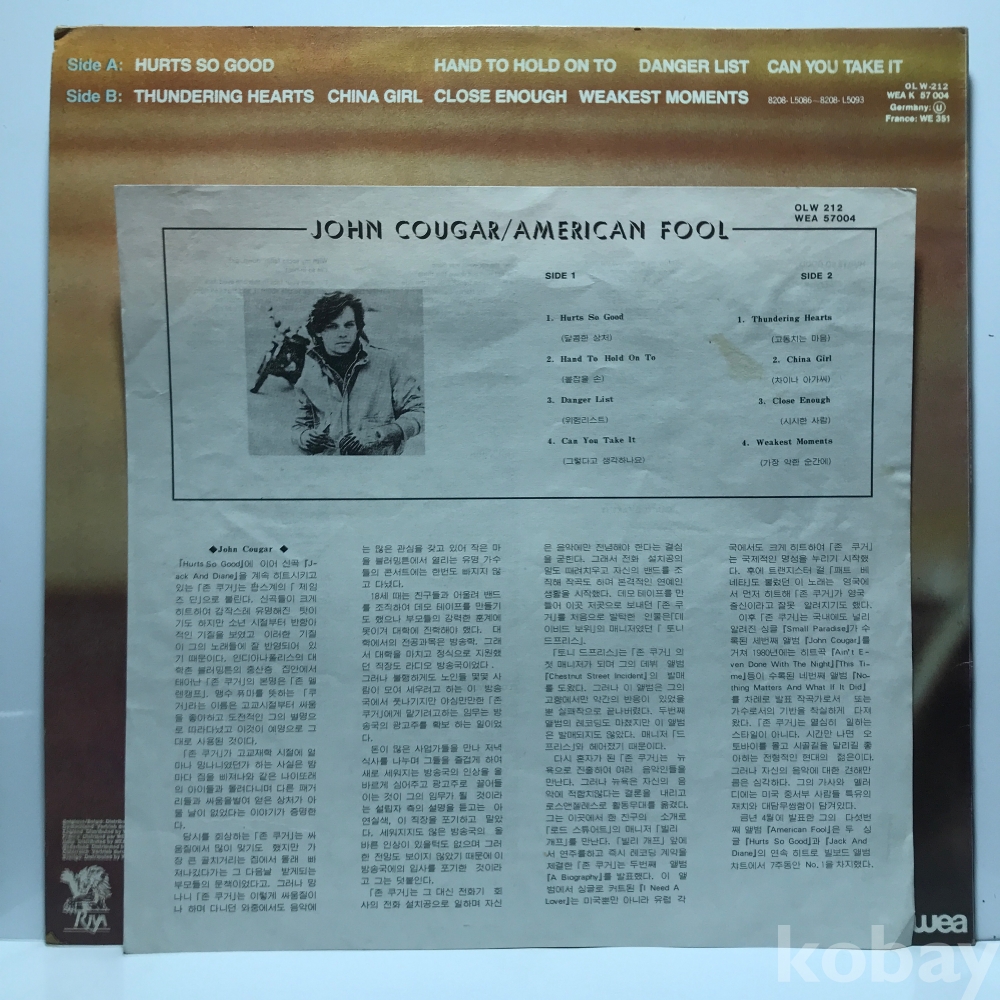 LP 83,820-88 John Cougar - American Fool _ 자켓 EX+ 알판 EX+ 82 년 국내반