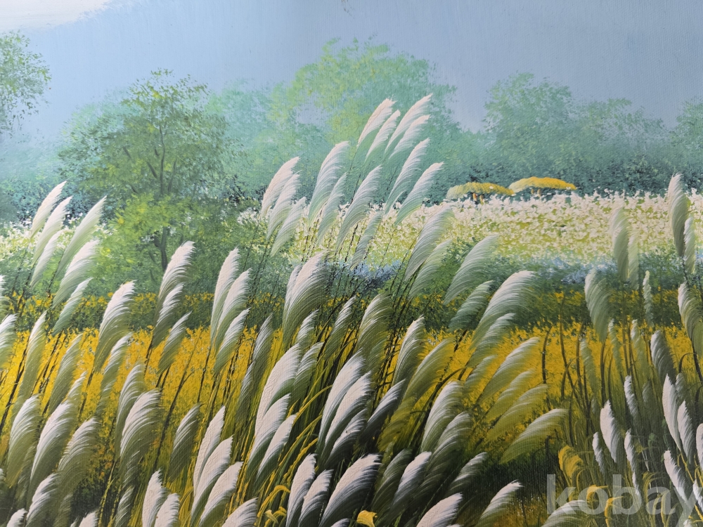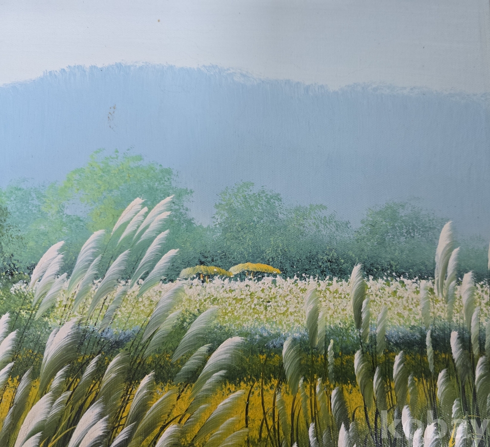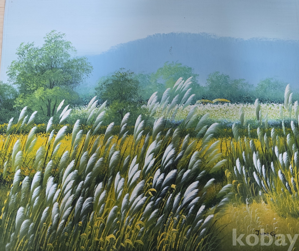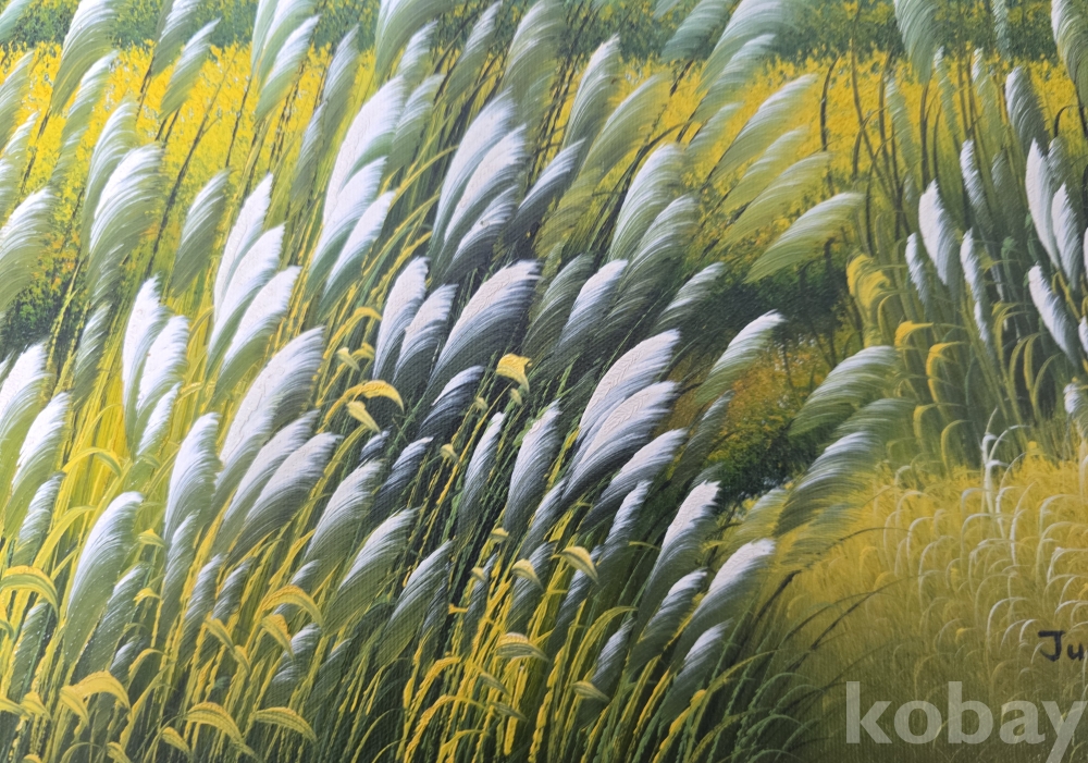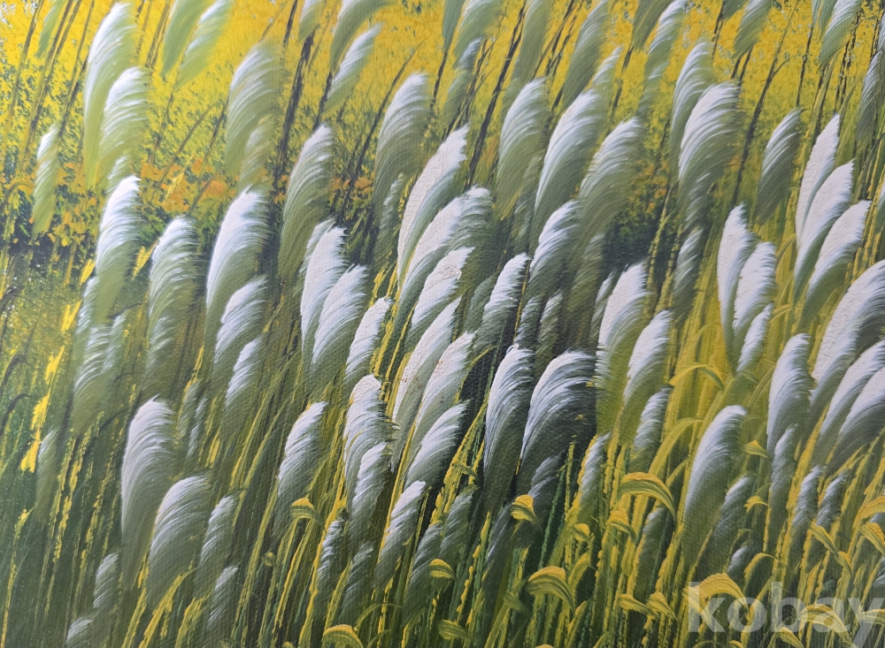 유화 특유의 묵직하고 두터운 질감(마티에르)이 살아있어, 가까이서 보면 갈대의 거친 느낌이 생생하게 전해집니다.