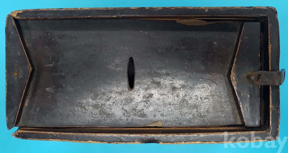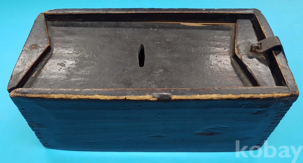 일제강점기 돈 통* 나무재질이며 상단에 동전을 넣을 수 있는 구멍이 뚫려있다 뚜껑은 밀어서 열 수가 있으며 고리가 달려있다