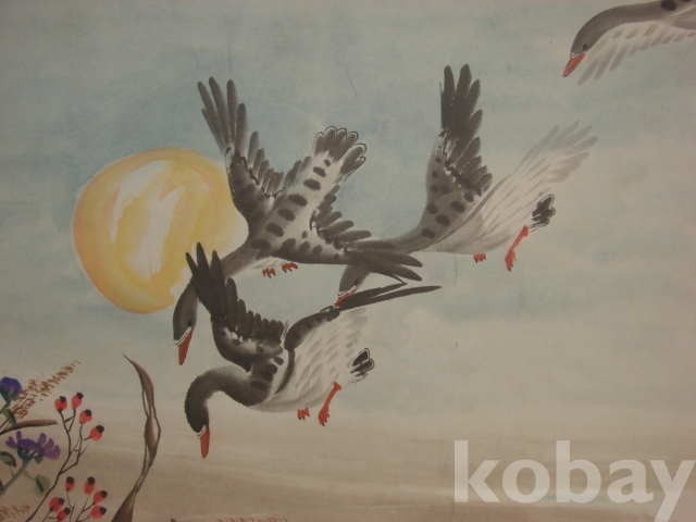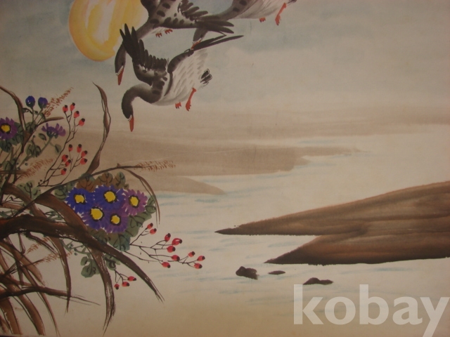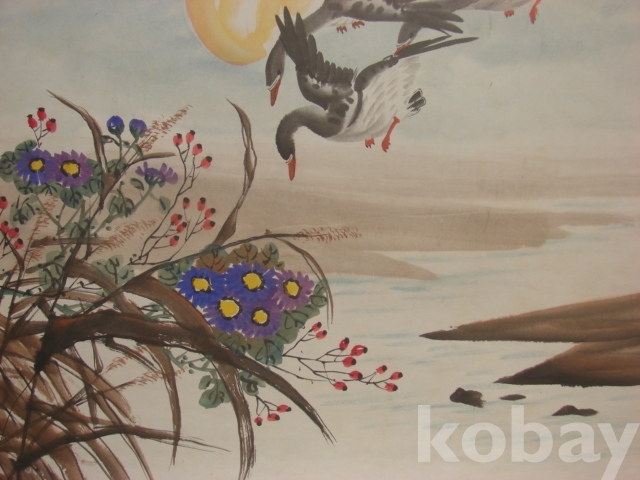 <노안도>: 기러기는 동양의 옛 산수화에 있어 가을 경치를 대표하여 ‘소상팔경도’ 가운데 ‘평사낙안(平沙落雁)’이 포함되기도 한다. 노안도(蘆雁圖)의 노안을 노안(老安)과 같은 의미로 여겨 노후의 안락함을 기원하는 그림으로도 그렸다.
