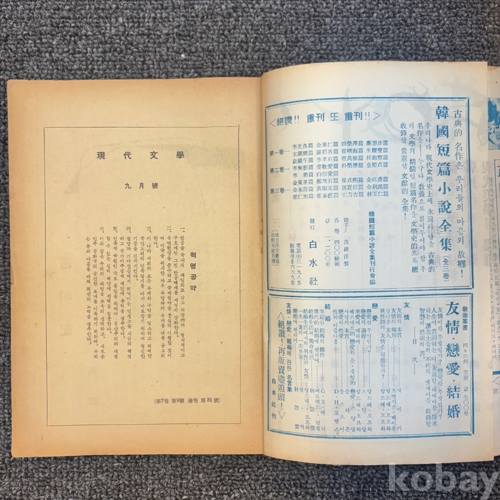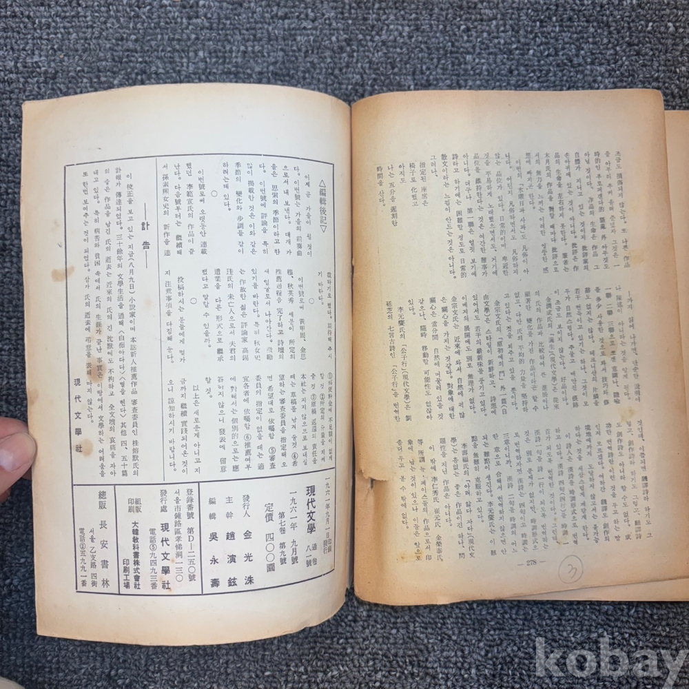 [한국현대사, 제3공화국, 문학] <현대문학 1961년 9월호 (제7권 제9호) >, 현대문학사, p. 278, 상태 중급(사진참조)