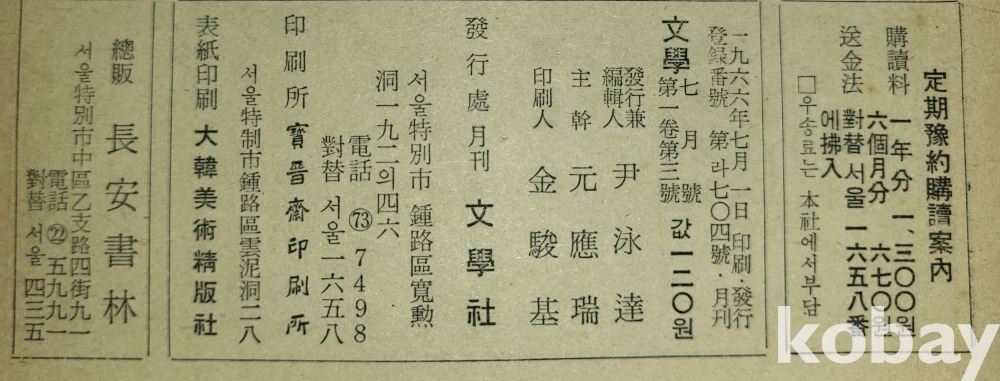 1세대 서영화가 김환기 표지화 그림이 함께하는 "문학" 1966년 발행입니다,