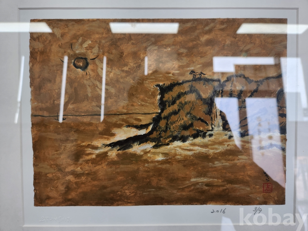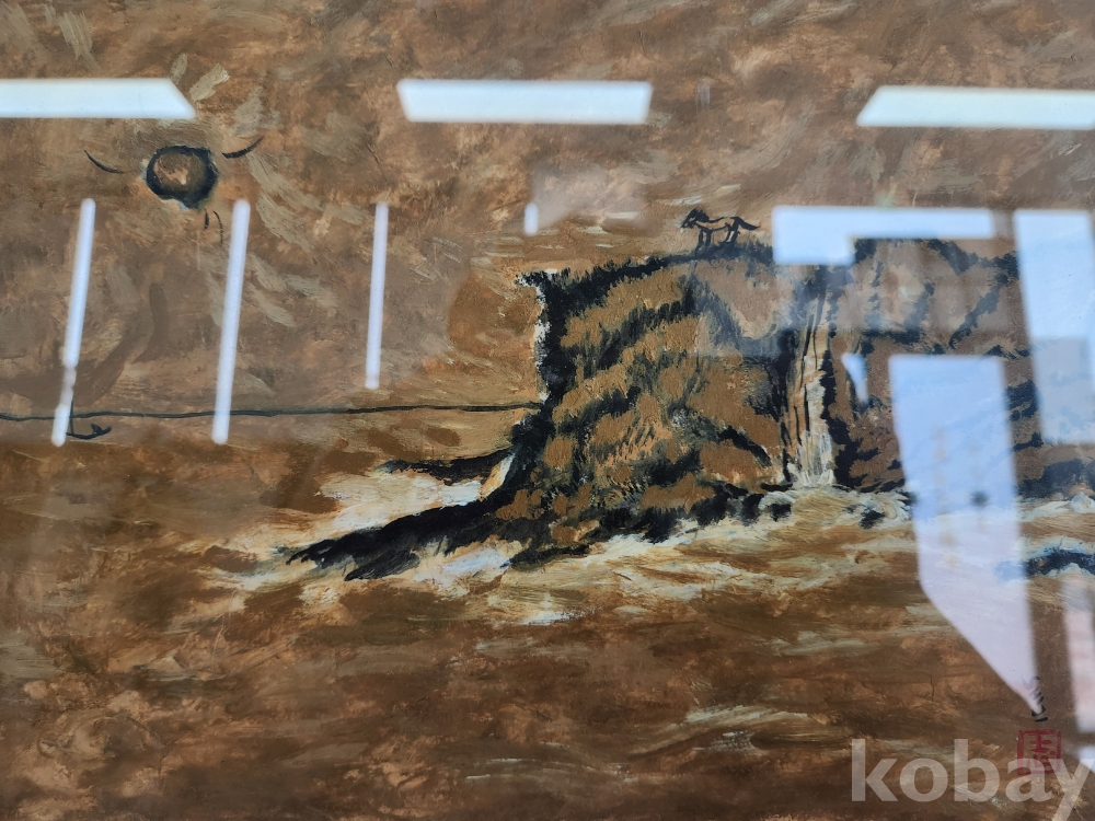 황토색 계열의 단색조 화면 위에 절벽과 바다 풍경이 단순화된 구도로 배치돼 있다. 화면 상단에는 해와 수평선이 놓여 있으며, 절벽 위에는 말 형상이 검은 필선으로 실루엣처럼 표현돼 있다. 넓은 여백과 대비되는 굵고 거친 선이 지형의 윤곽을 형성하고, 화면 전체는 절제된 색채와 반복되는 붓질로 정적인 분위기를 보인다.
