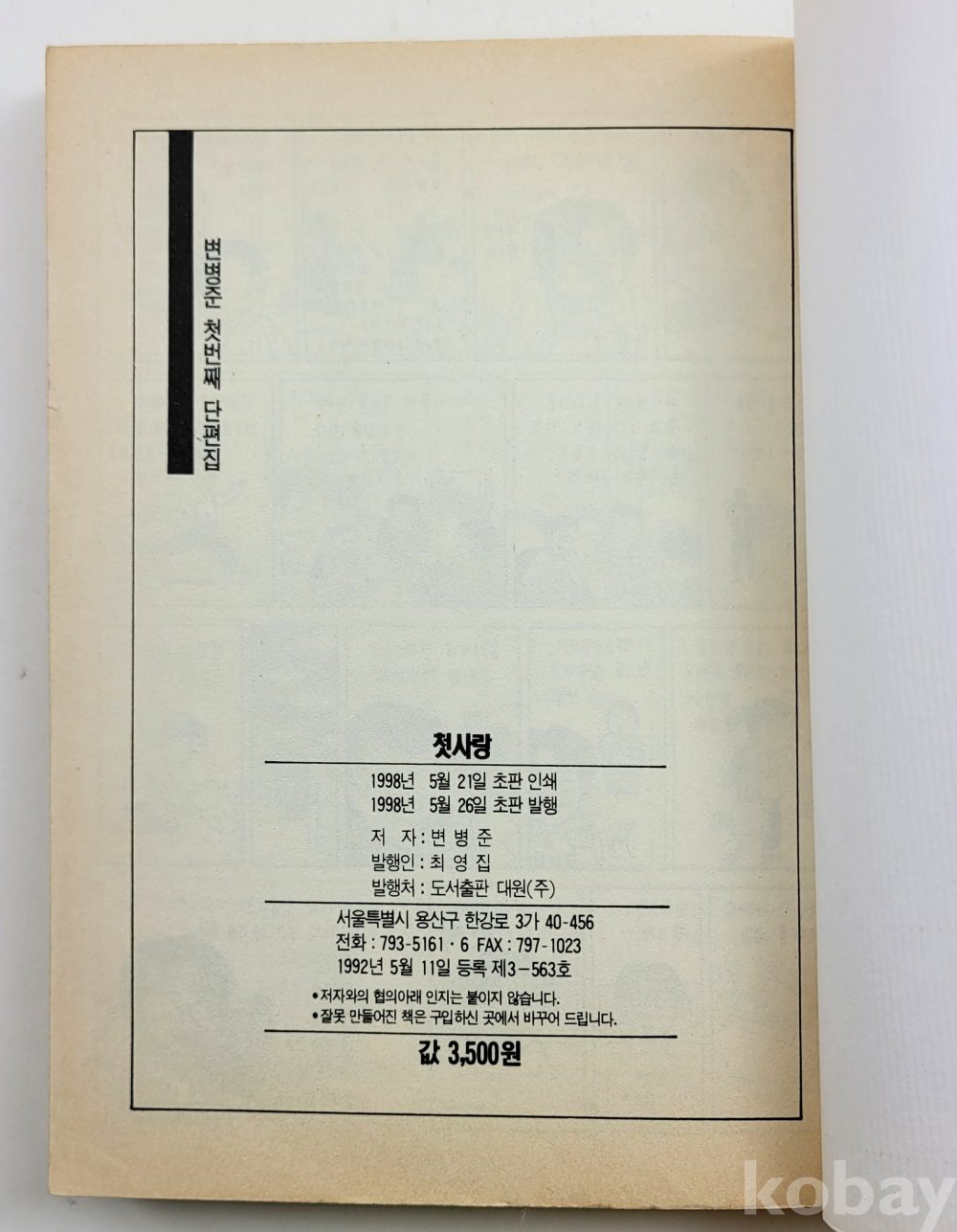 물 품 명 | 변병준 / 첫사랑 / 첫번째 단편집 / 대원특선만화 / 1998년 초판 / 도서출판대원(주) |