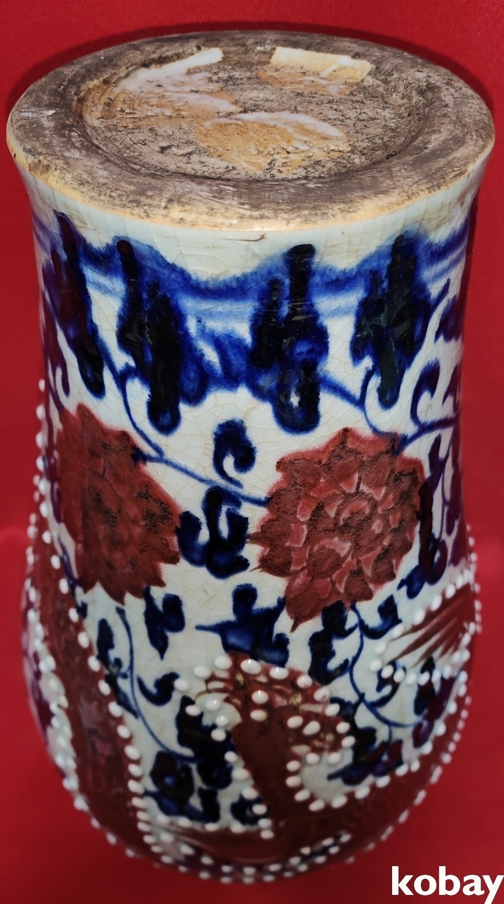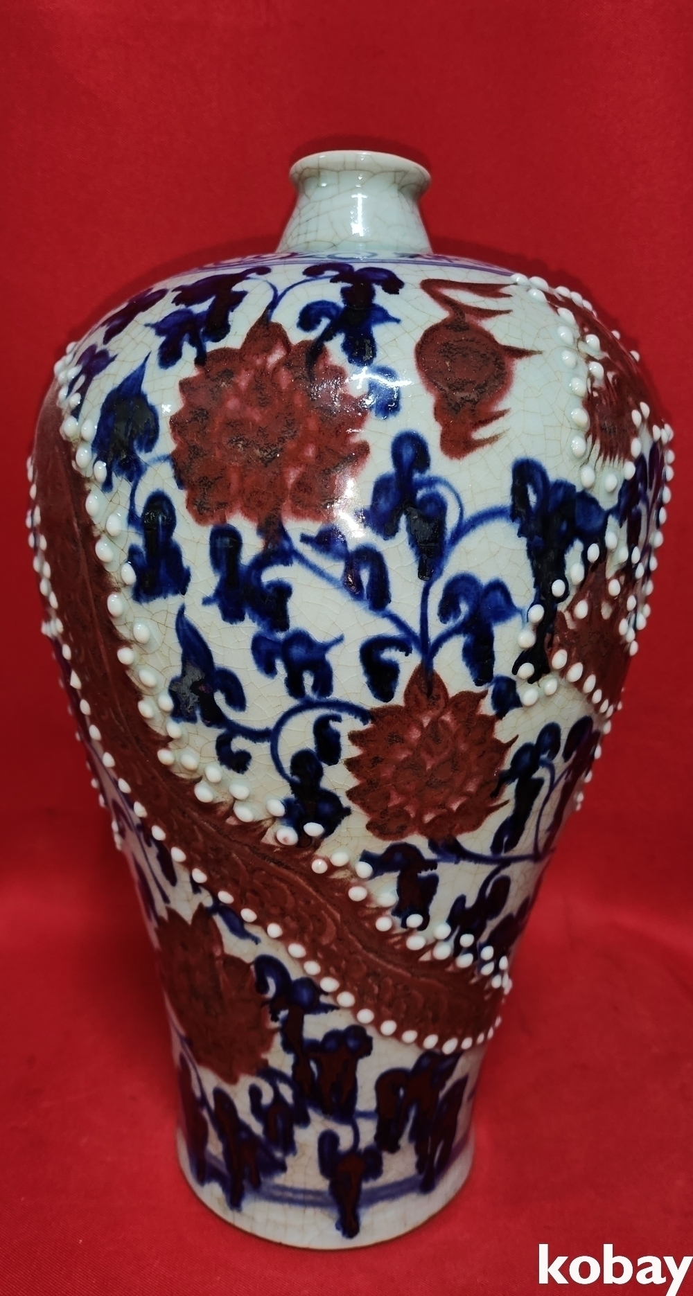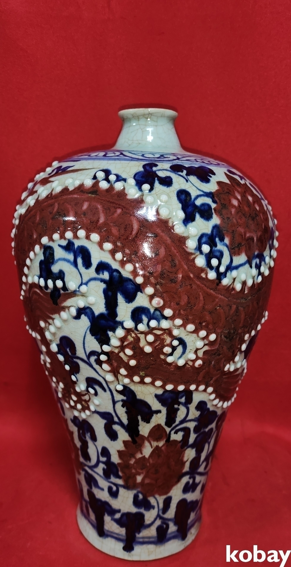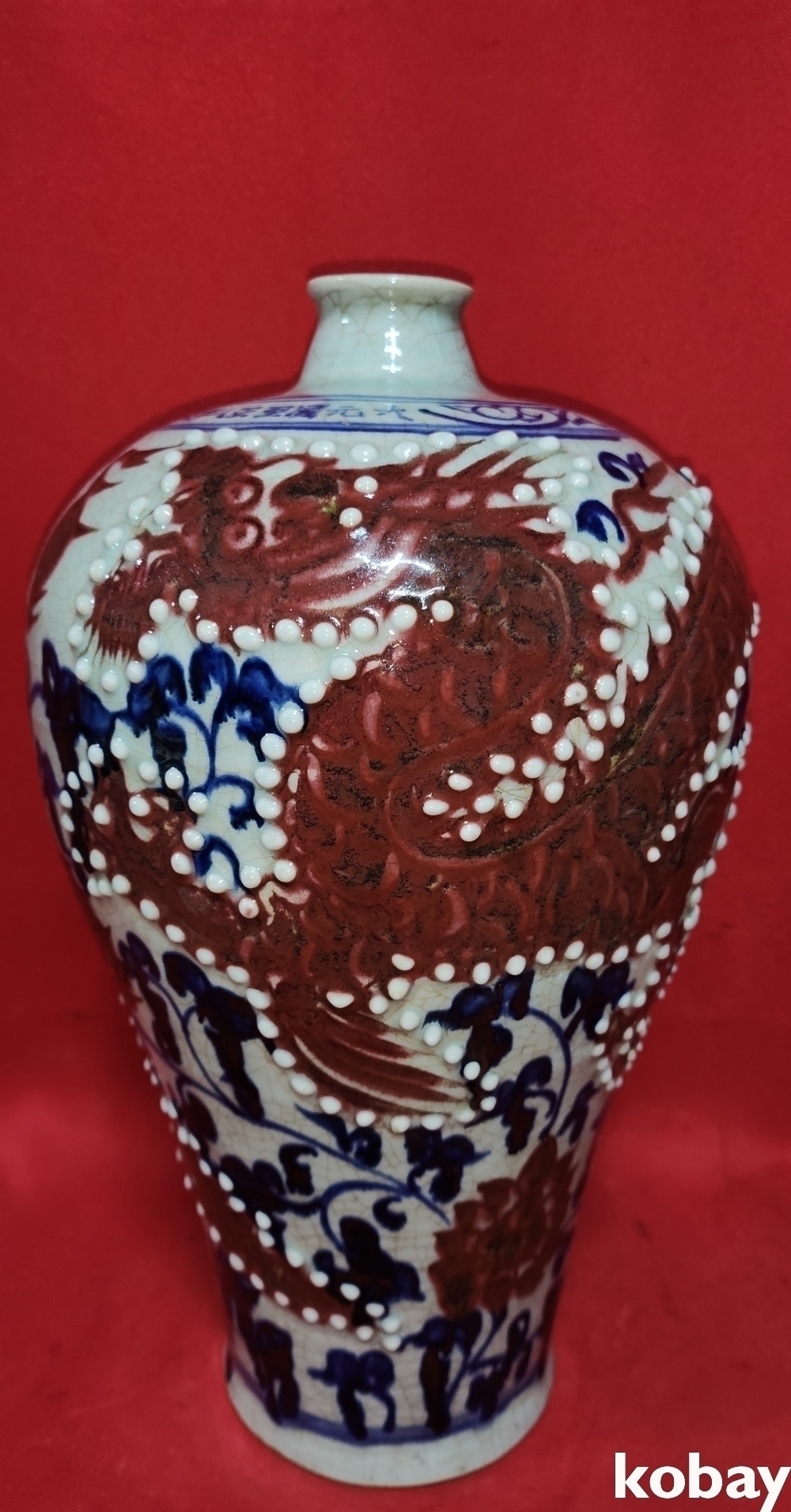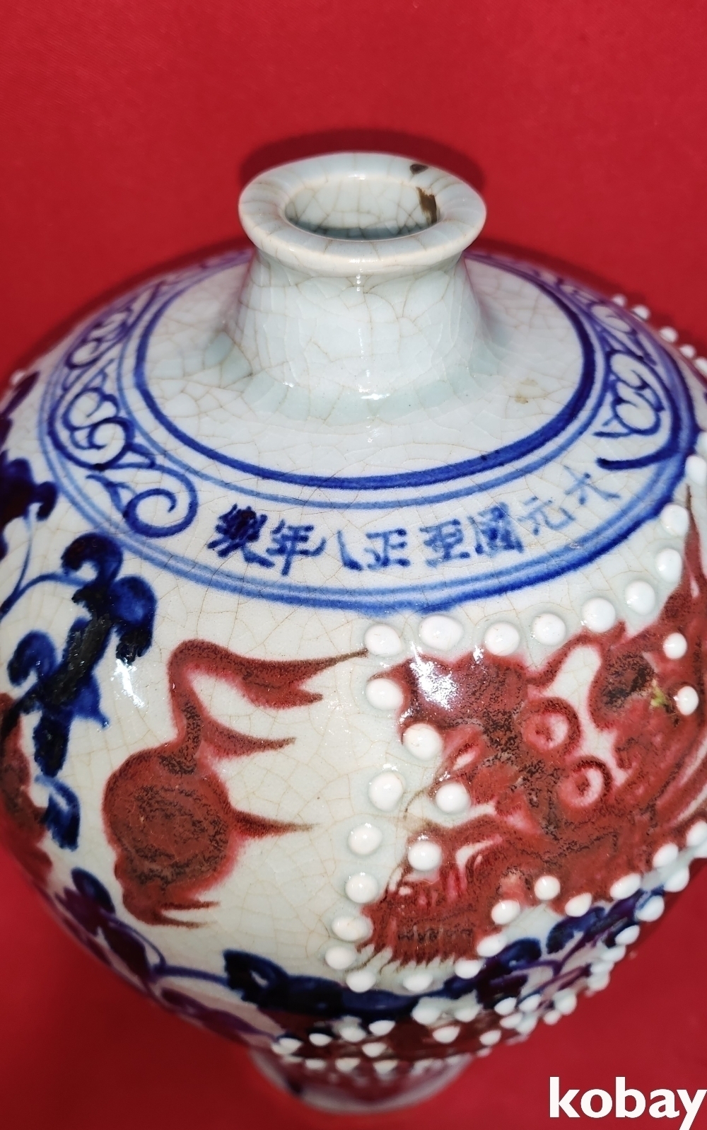 대원국지정8년제 관지가 어깨선에 보이는 청화 유리홍 홍용(紅龍)문 매병입니다,