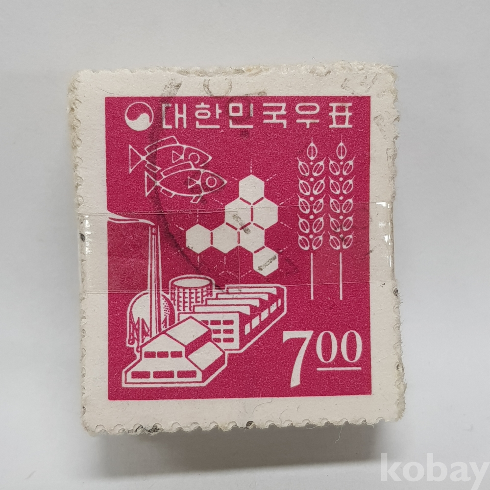 *천원경매* 약100매 / 1960년대 신원화 7원 산업도안 일부인 미확인 사용제 우표 약 100매 묶음 [ 우표 / 우취자료 / 보통우표 / 그라비아 ] #48(A)-0204 #CO #HH