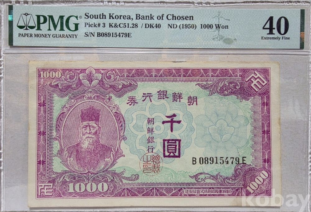 -대한민국 조선은행권 미발행권 1000원 PMG 40 등급 입니다.