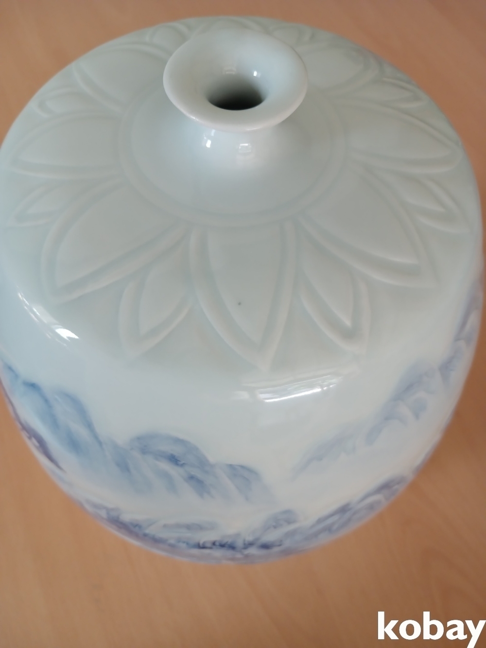 산수 풍경을 아름답게 표현한 입이 작은 도자기 입니다.