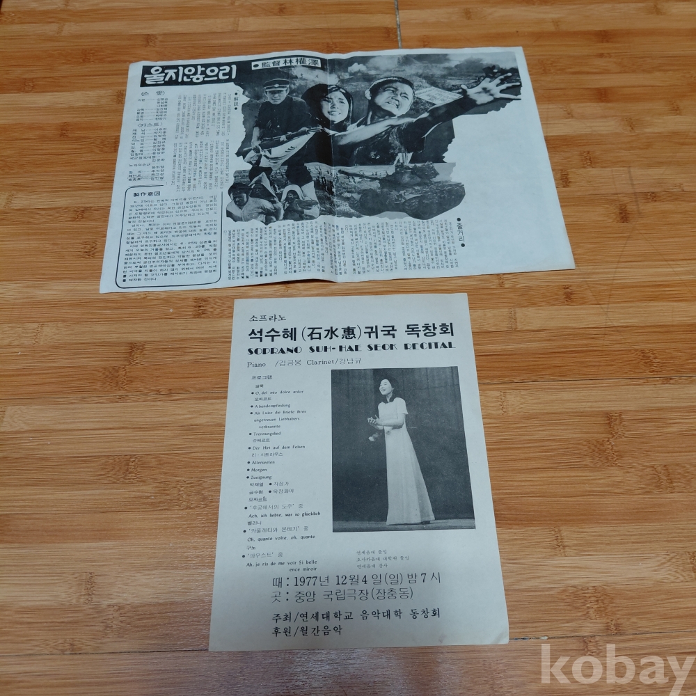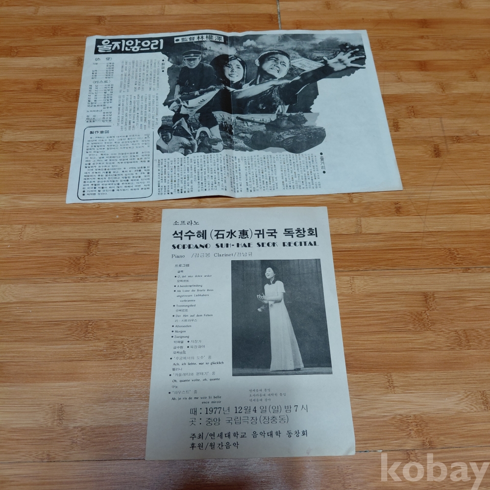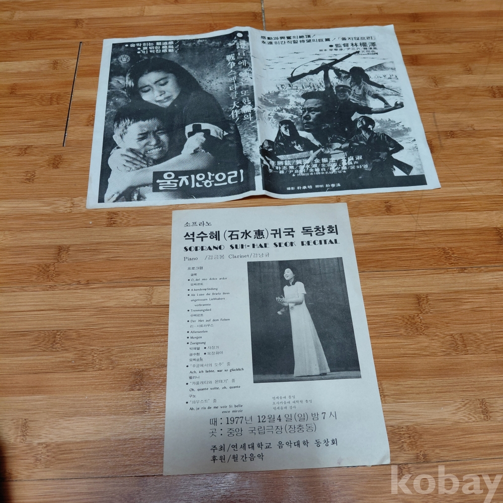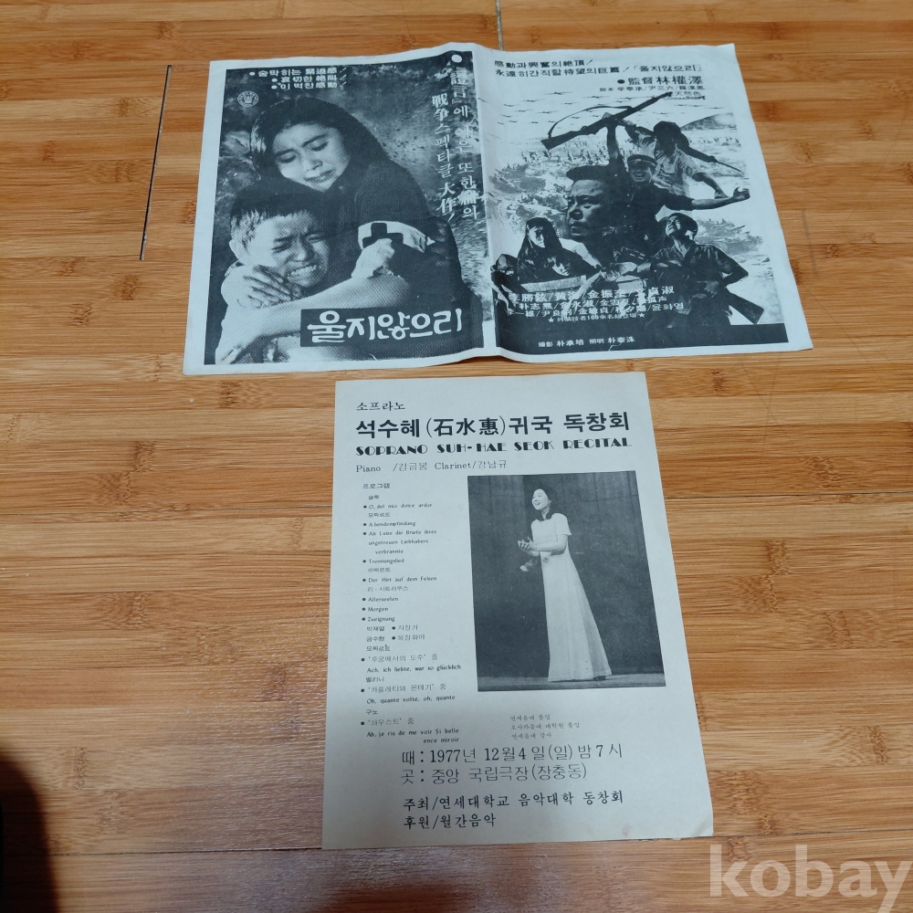 임권택 감독 이승현주연 울지않으리 광고 전단지 ㆍ석수혜 귀국독창회 홍보 팜플렛 두점 다원본 입니다 70,년대귀한 자료입니다