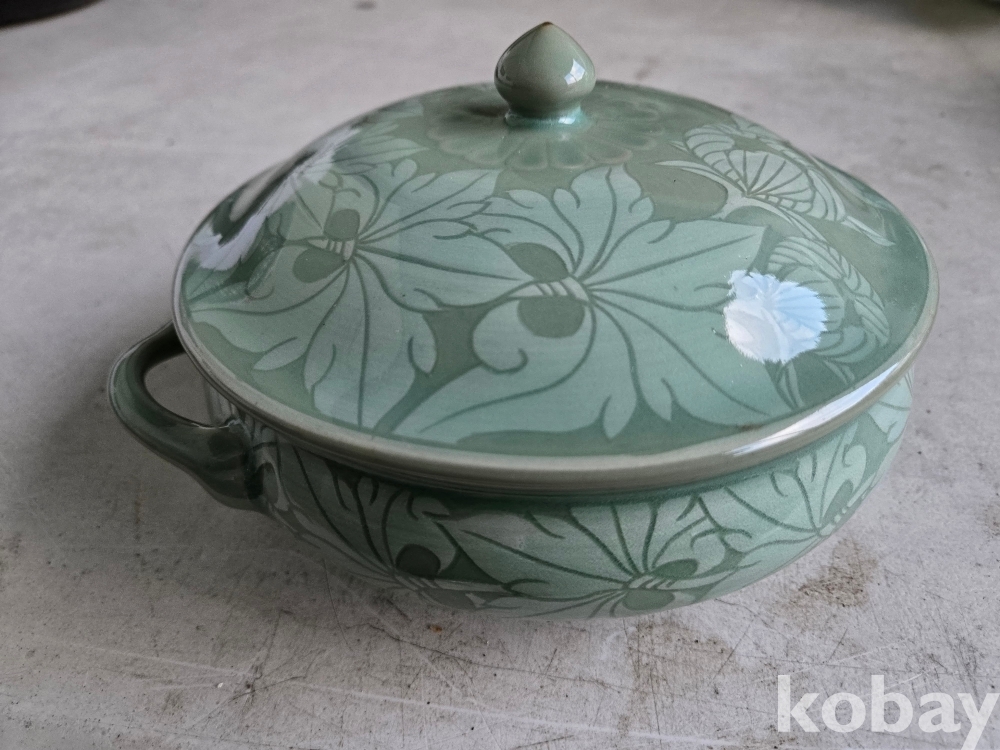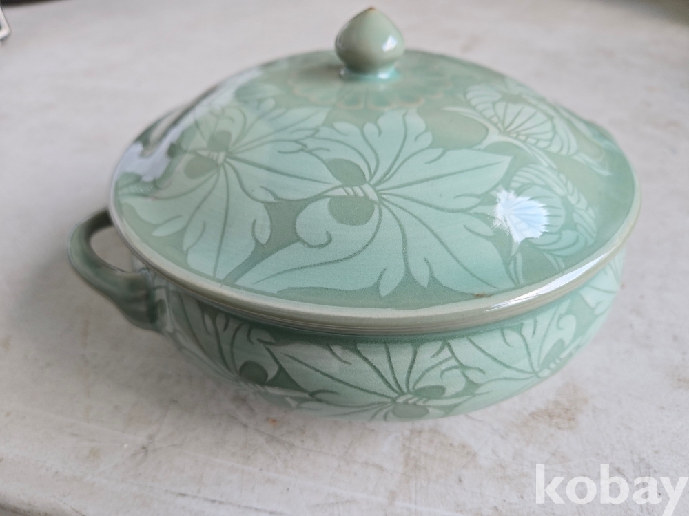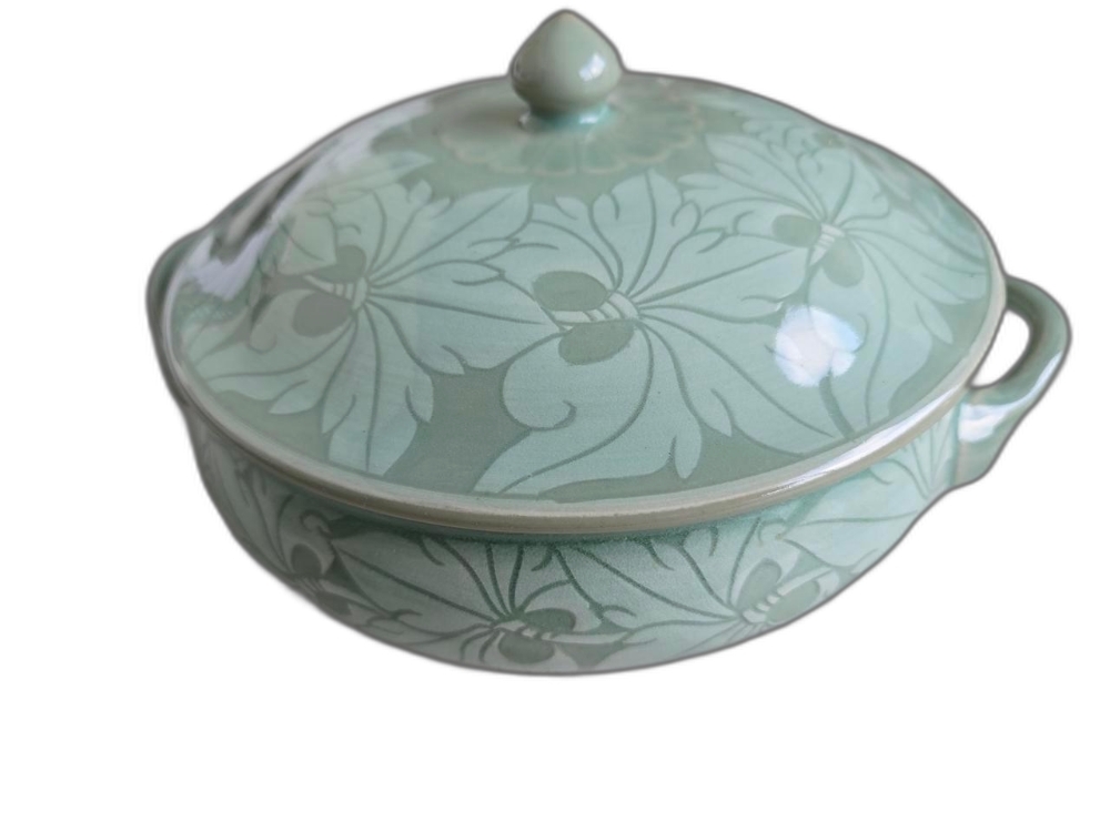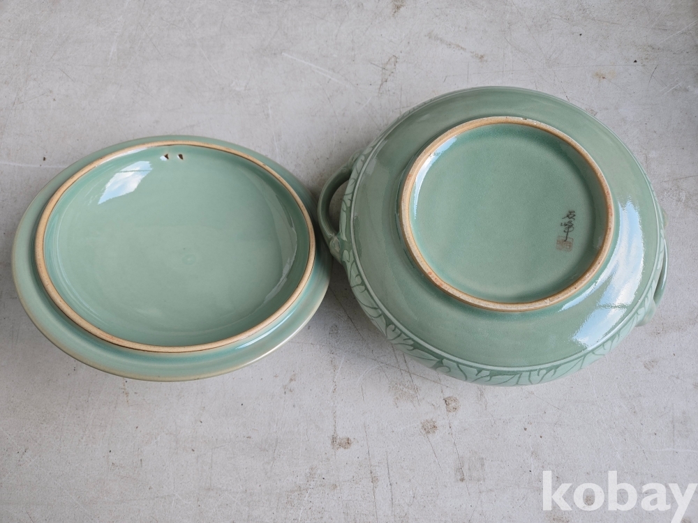 석봉 도예가의 나무 문양이 있는 청자 양이 합 입니다.
