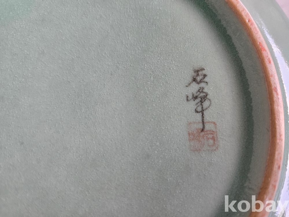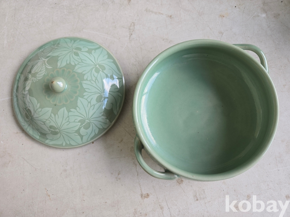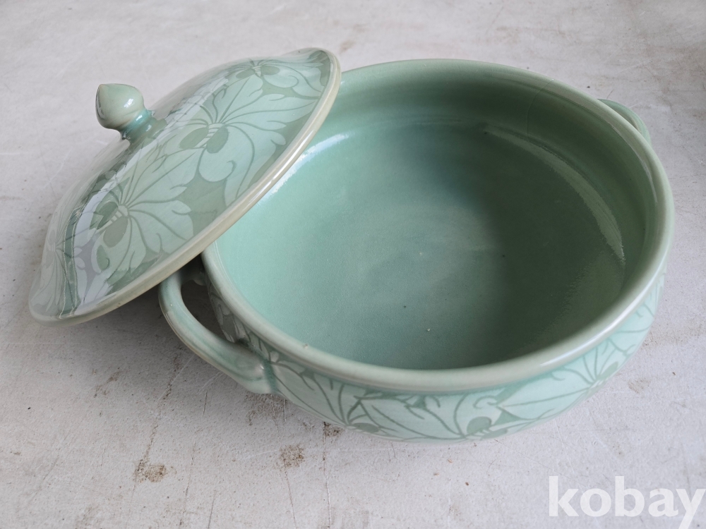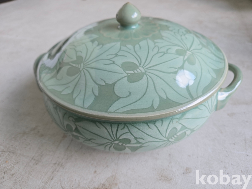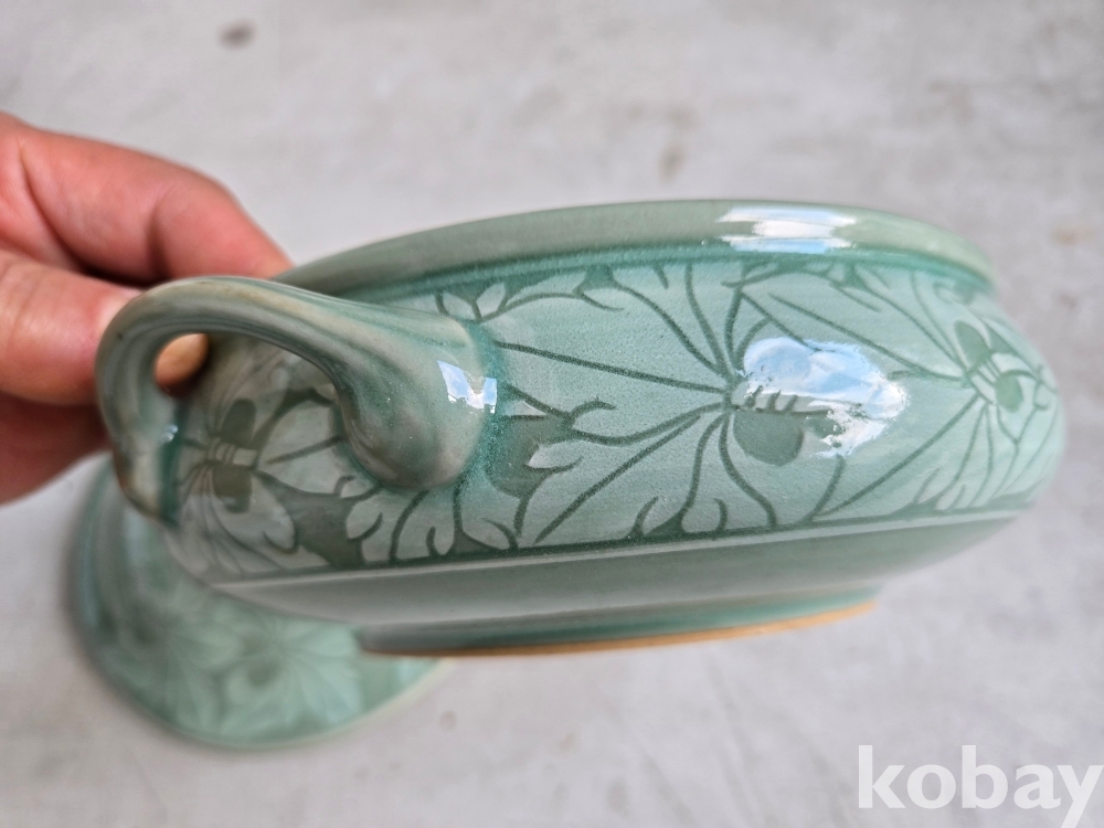 석봉 도예가의 나무 문양이 있는 청자 양이 합 입니다.