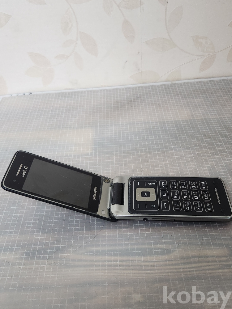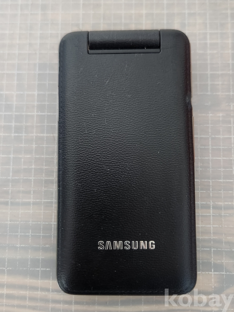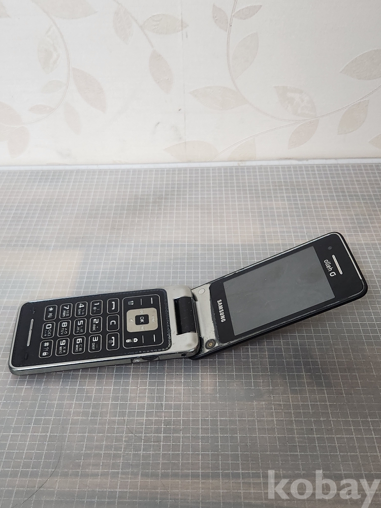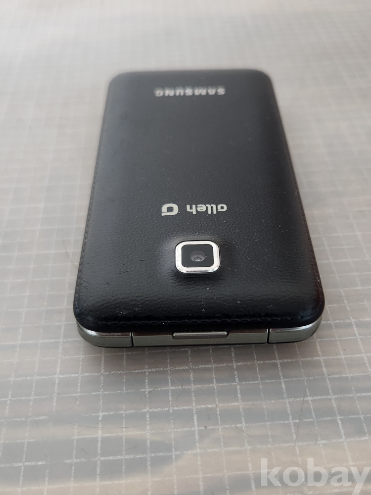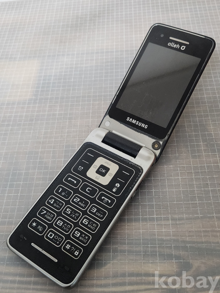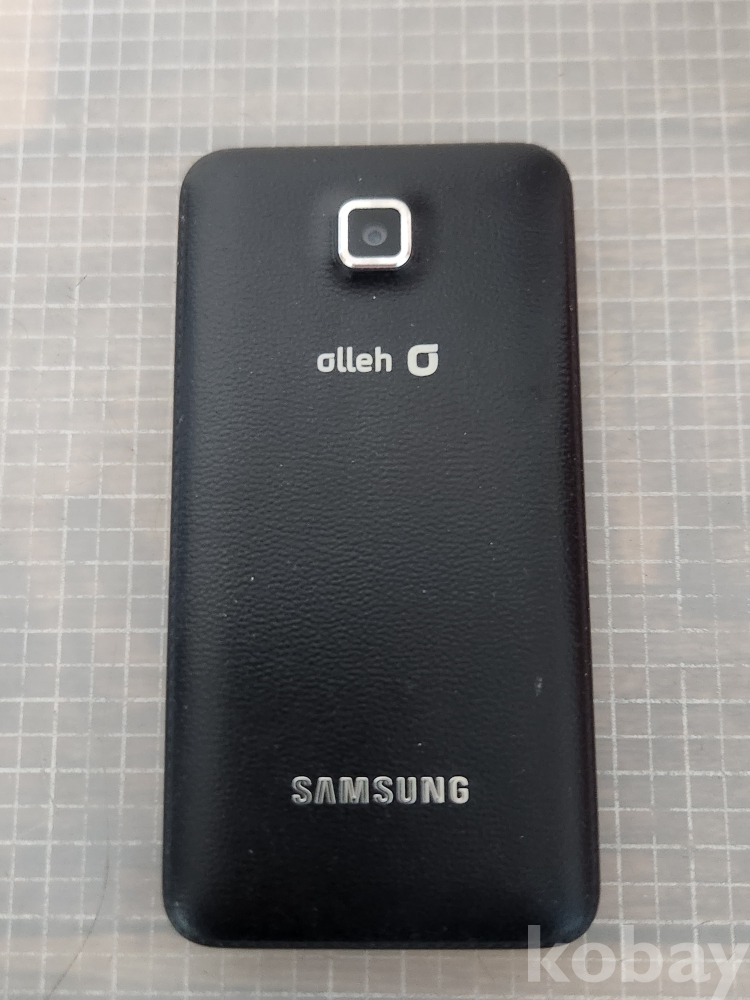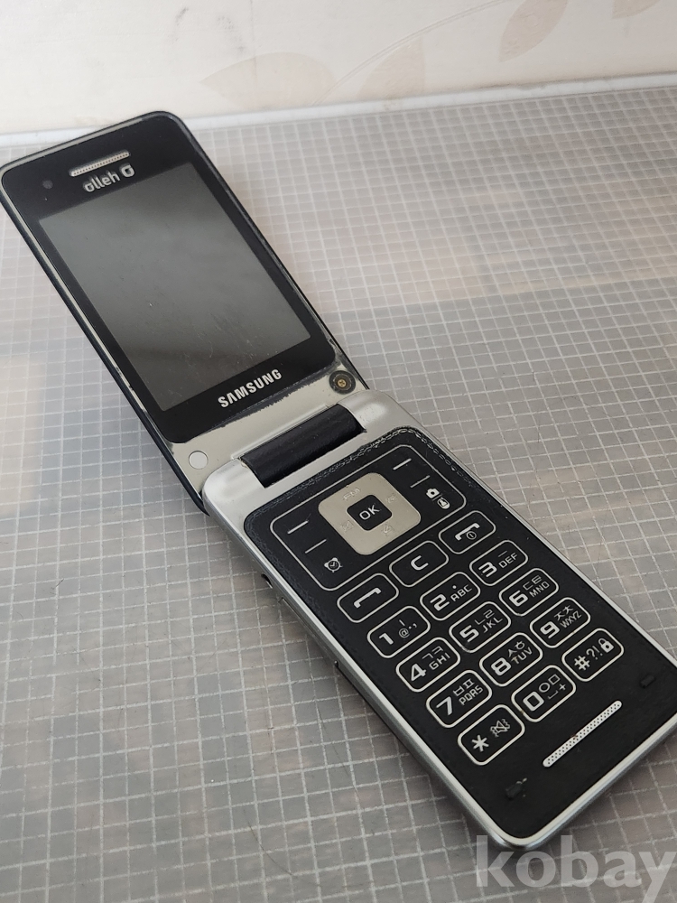 (땡처리) 삼성 폴더폰 블랙 색상입니다. KT Olleh 로고가 전면과 후면에 있습니다. 효도폰으로 사용하기 좋습니다