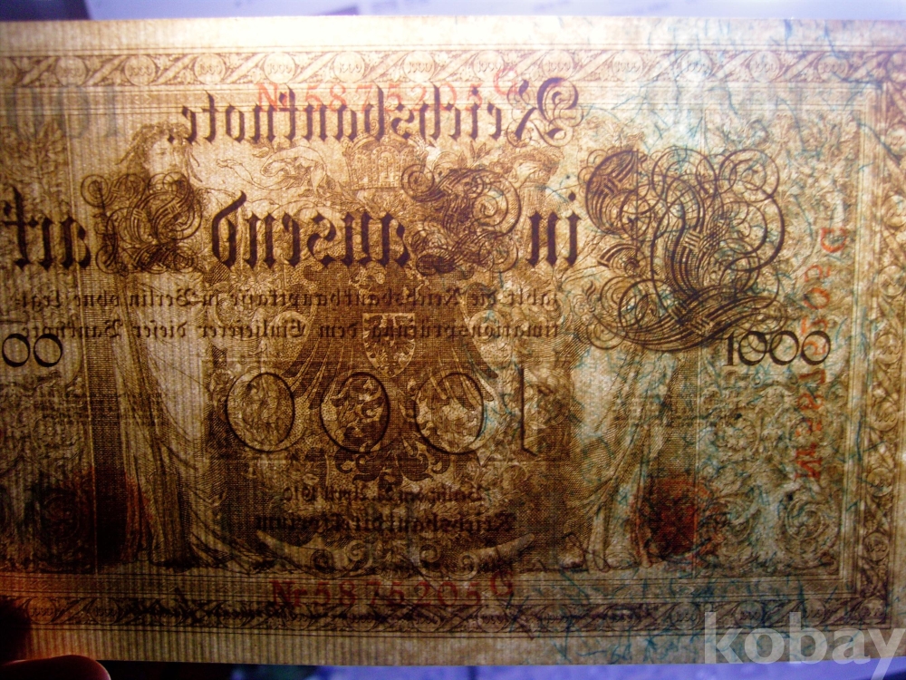 표시가 있는 면의 왼쪽에 푸른 미세한 비단실 조각들이 흩어져 붙어있는데 위조방지를 위한 안전장치입니다. 이 위폐방지 기술은 미국인 윌콕스(J.M. Wilcox)가 특허를 가지고 있어 독일에서 이 기술을 도입했다 고 합니다.