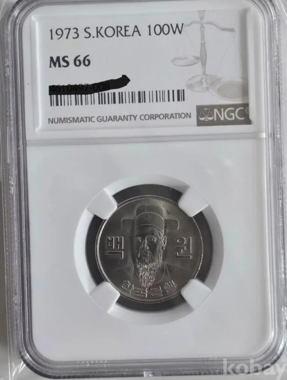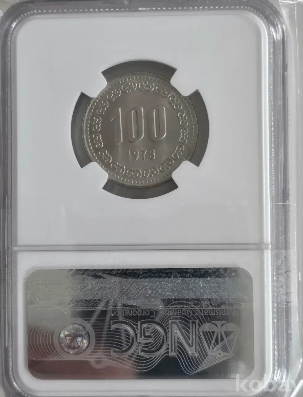 1973년에 발행된 100원 동전 MS 66 등급입니다. NGC에서 감정한 고등급 동전이며, 상태 좋습니다. 케이스에 보관되어 있어 안전하게 소장 가능합니다.