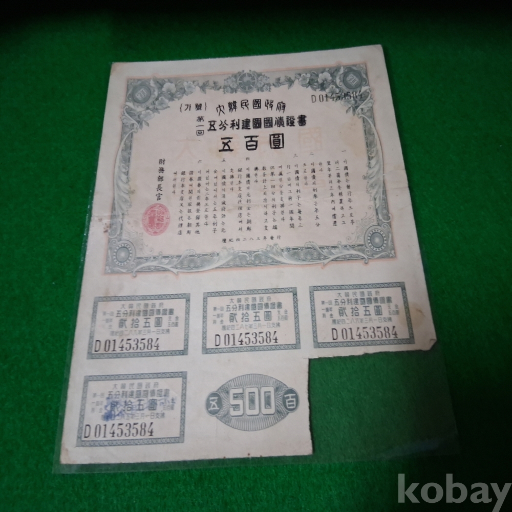 대한민국 1950년 건국채권 1회500원 사용제