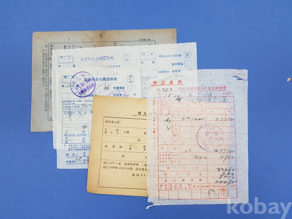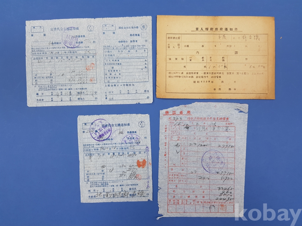 전라북도 부안군 행안면 농업 관련 자료 5부* 벼 매도대금지불통지서,양곡공판대금 지불전표,매입양곡출하통지서 양곡매입증