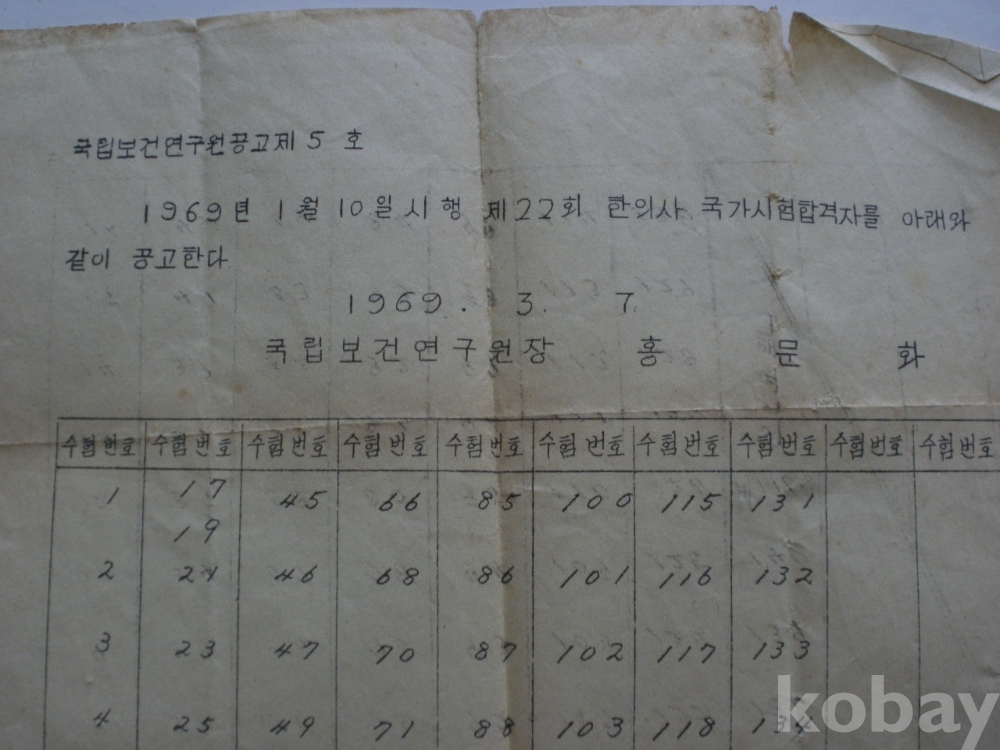 한의사 국가시험 - 합격자 공고 (1969년, 국립보건연구원장)