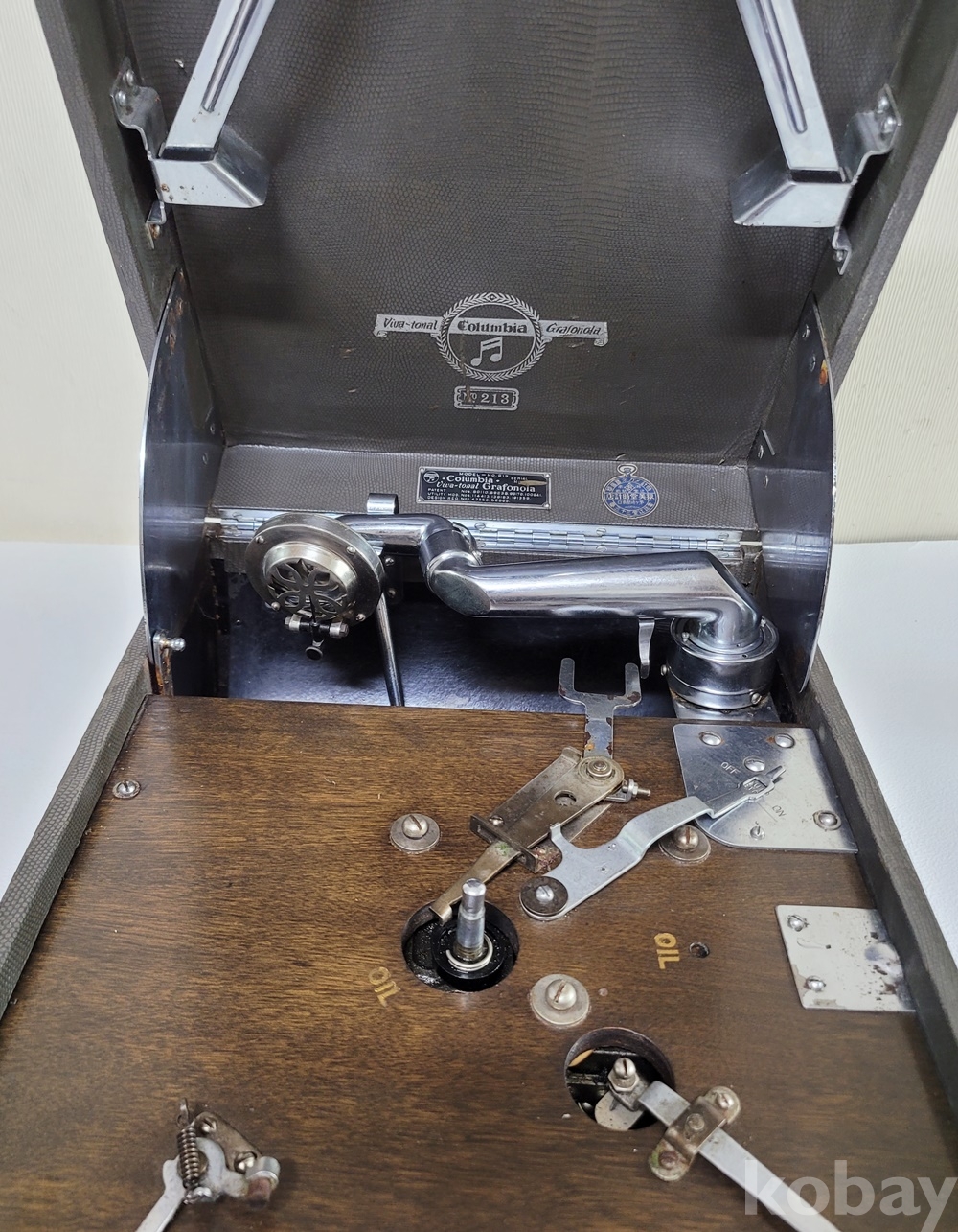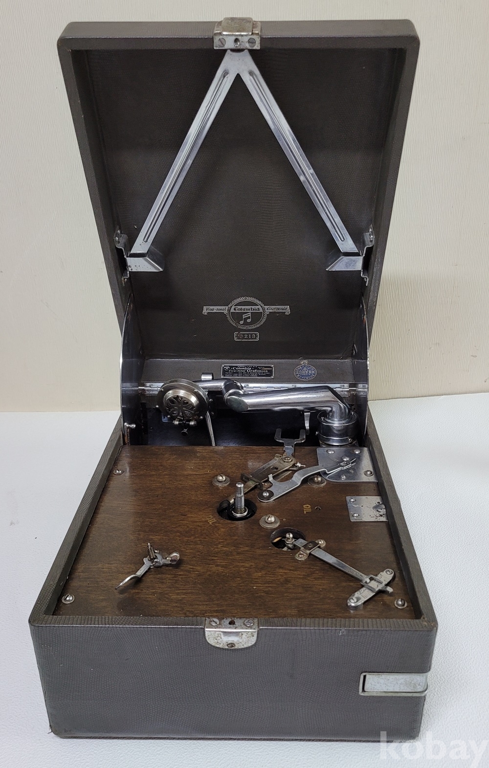 본 COLUMBIA 축음기는 튼튼한 기계에 내구성이나 재생 음이 타사 기종에 비하여 탁월하며 COLUMBIA 가방식 휴대용 들 중 모델 N0 213 본체 무게가 3kg 정도 더 나가고 튼튼하며 회전의 정지 기능도 수동과 자동으로 우수합니다.