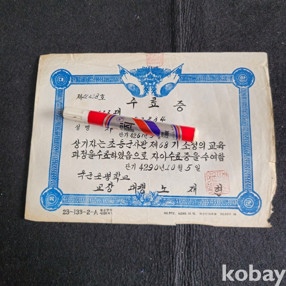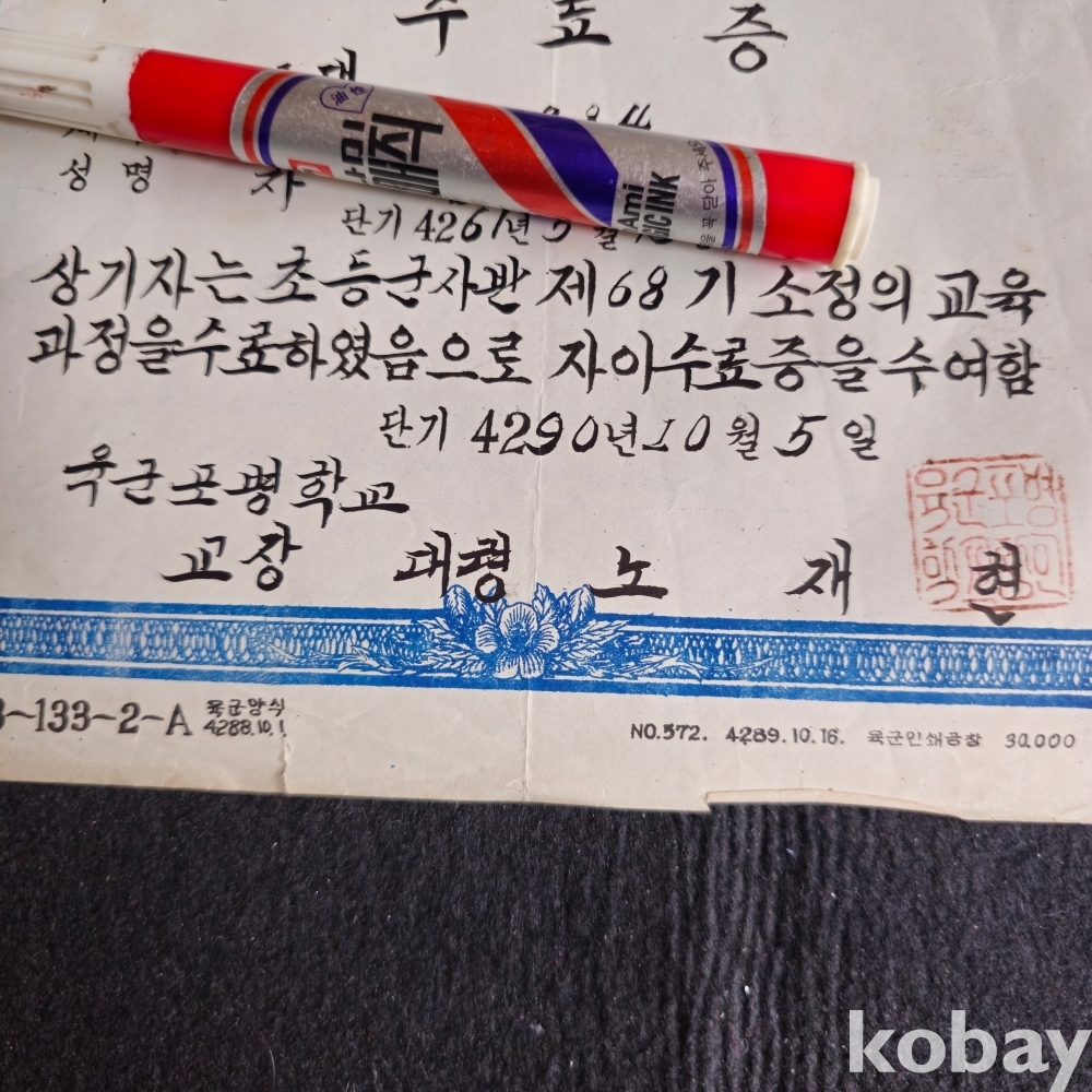 (((군자료))) 단기 4290년 (서기 1957년) 육군포병학교 교장 대령 노재현 증 수료증