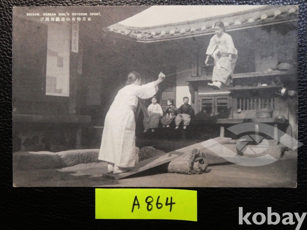 ▣근대한국엽서(진본): 조선 정월 특유의 널뛰기 놀이/1매/조선풍속/일제강점기 사진엽서, 그림엽서, 회엽서. A864