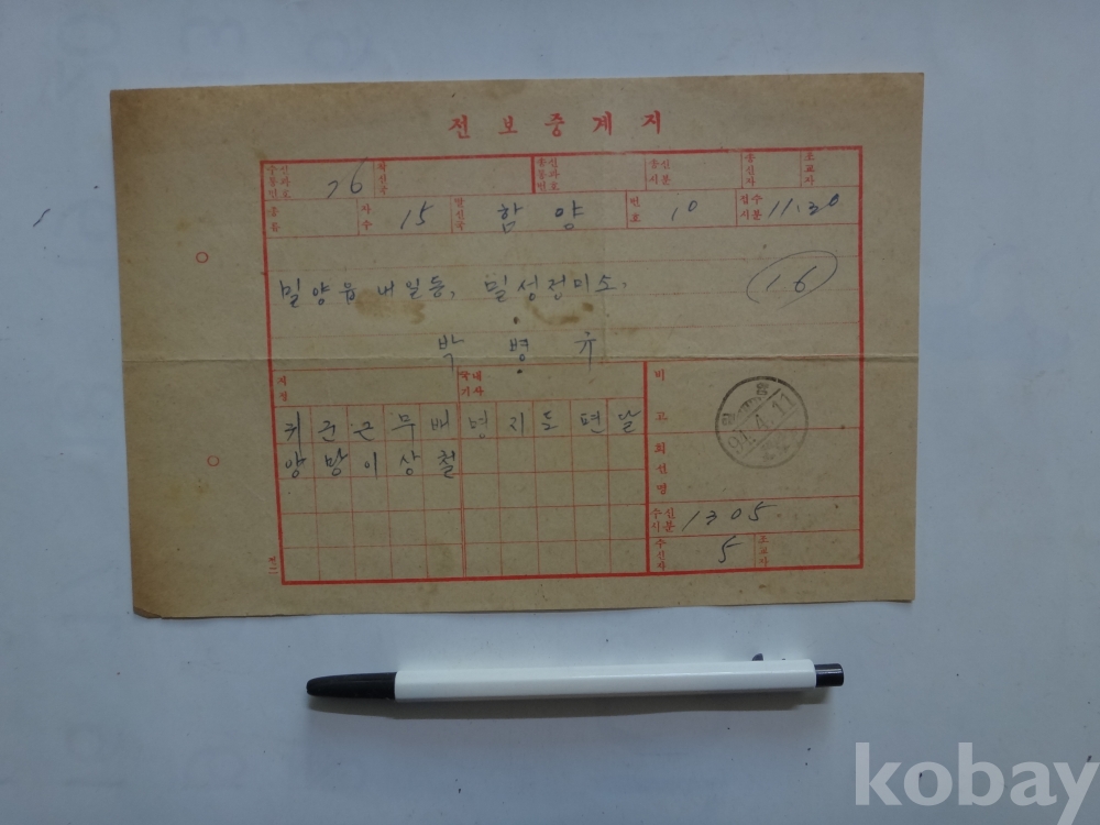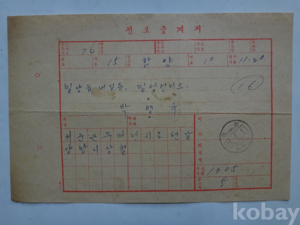 전보 중계지 - 귀군 근무 배명 지도 편달 앙망 (밀양읍 내일동 밀성정미소, 함양)