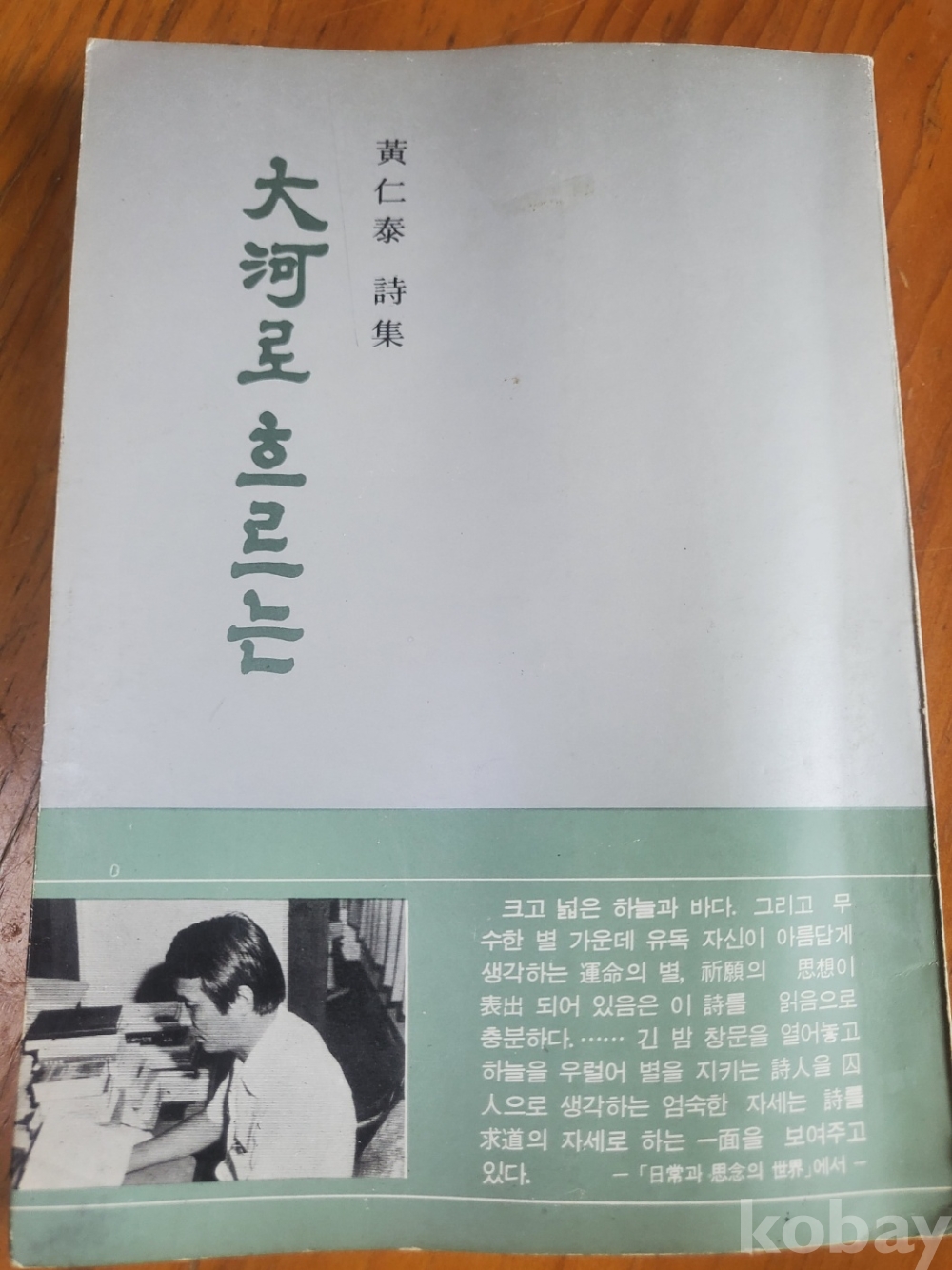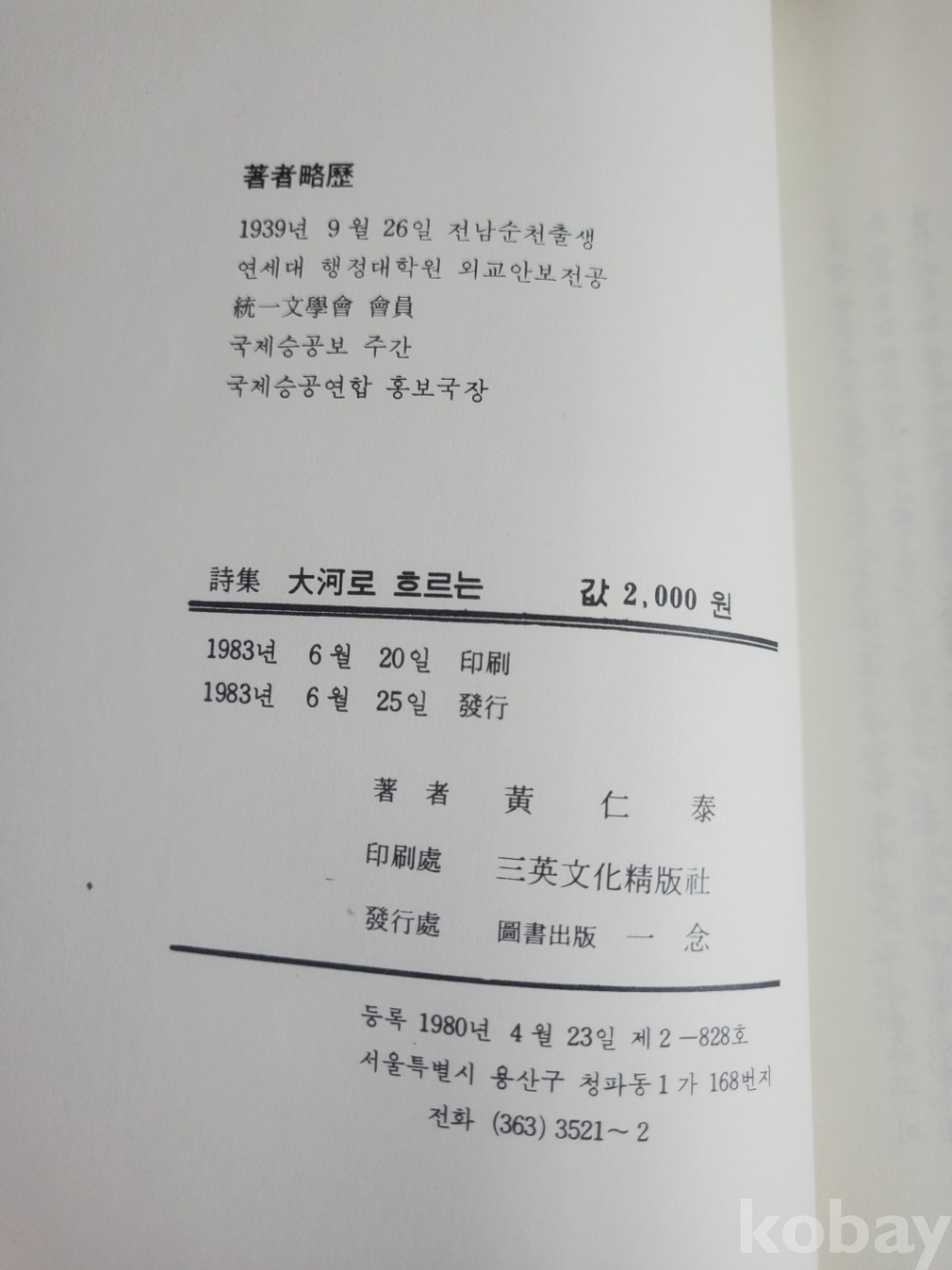 1. 대하로 흐르는, 황인태, 도서출판 일념, 1983년, 159쪽, 상태 상, 사진 참조