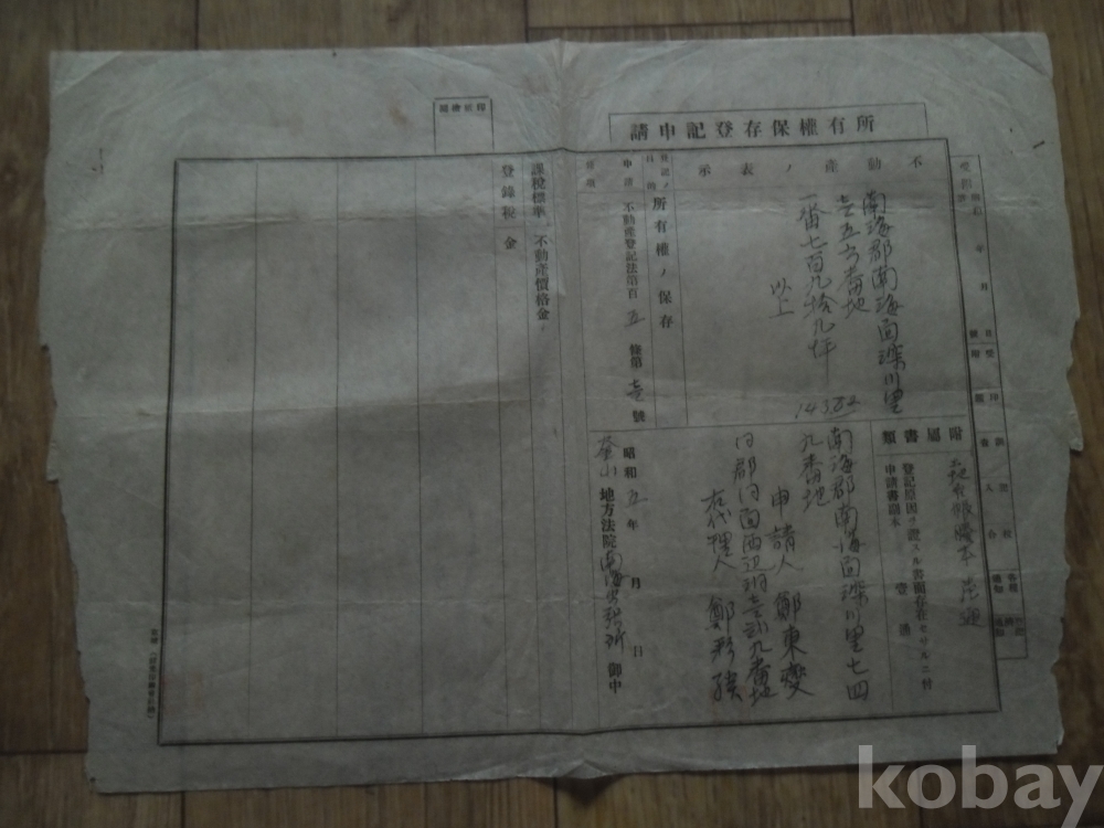 소화5년 발행 부산지법 소유권보존등기신청서(남해군)