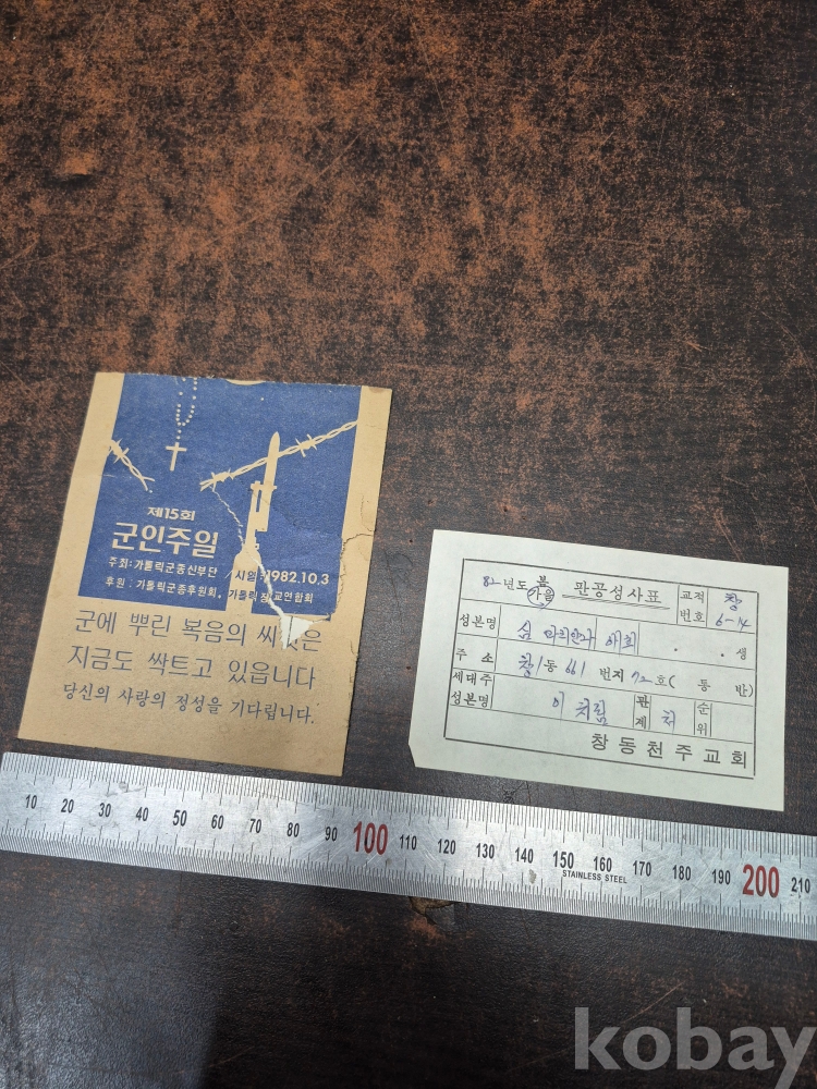 1982년 10월3일 제15회 군인주일 창동 천주교회 판공성사표 1점 대한 예수교 장로회 도원교회 모시는글 1점 10*17