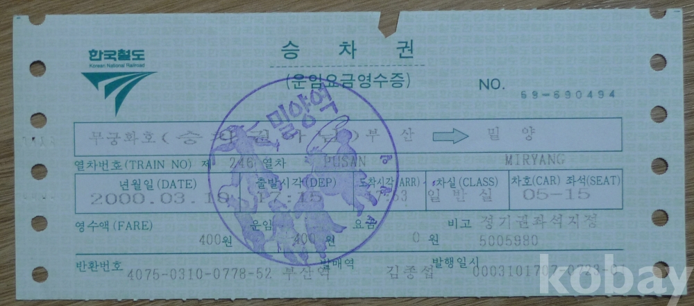 2000년 경남 밀양역 기념 일부인 부산 - 밀양 무궁화호 승차권