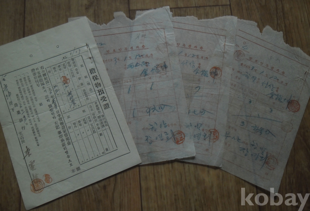 1960년 농업은행 담보물예수증(담보양곡검사증 3매 포함)