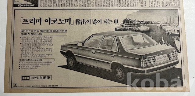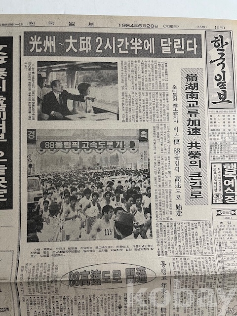 88고속도록 개통소식 기사와 프리마 자동차 광고가 실린 한국신문 낱장입니다.