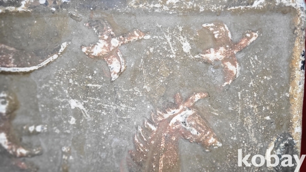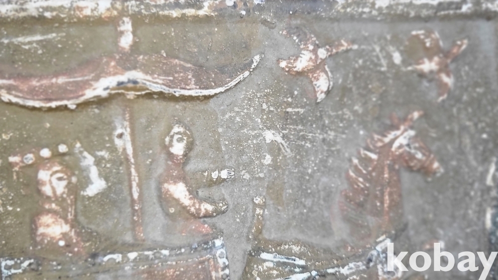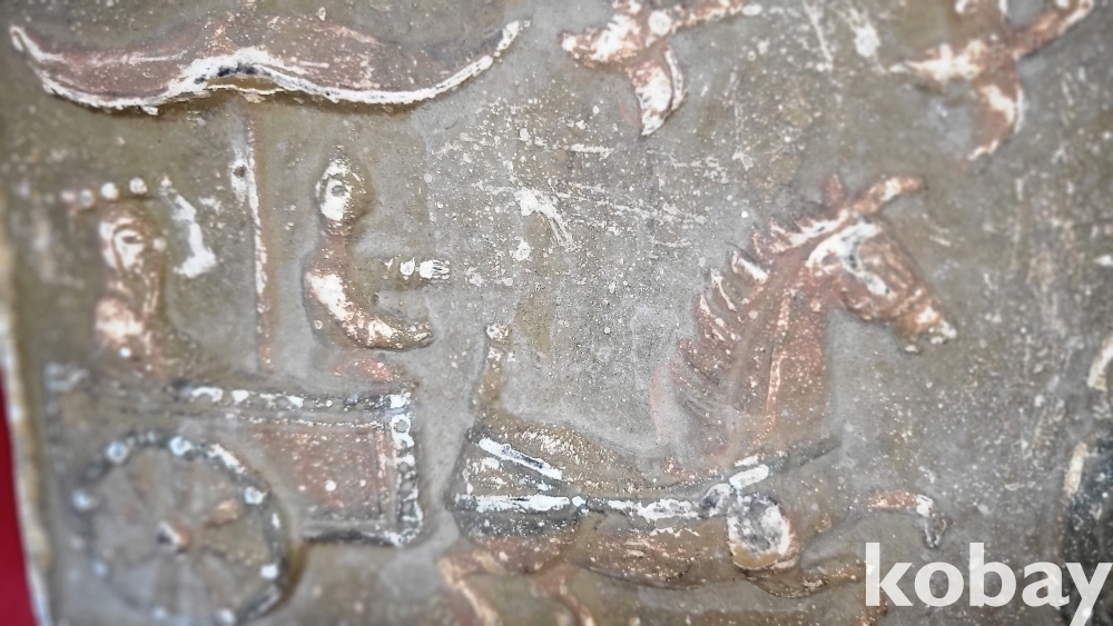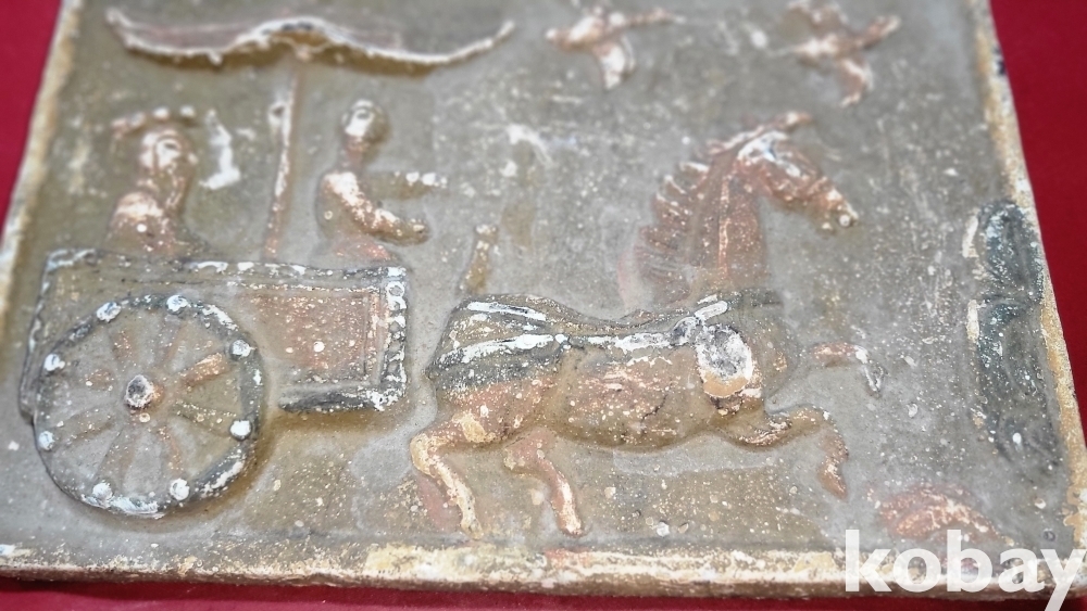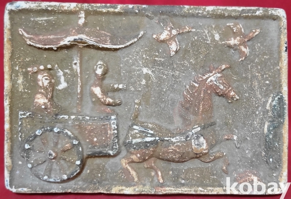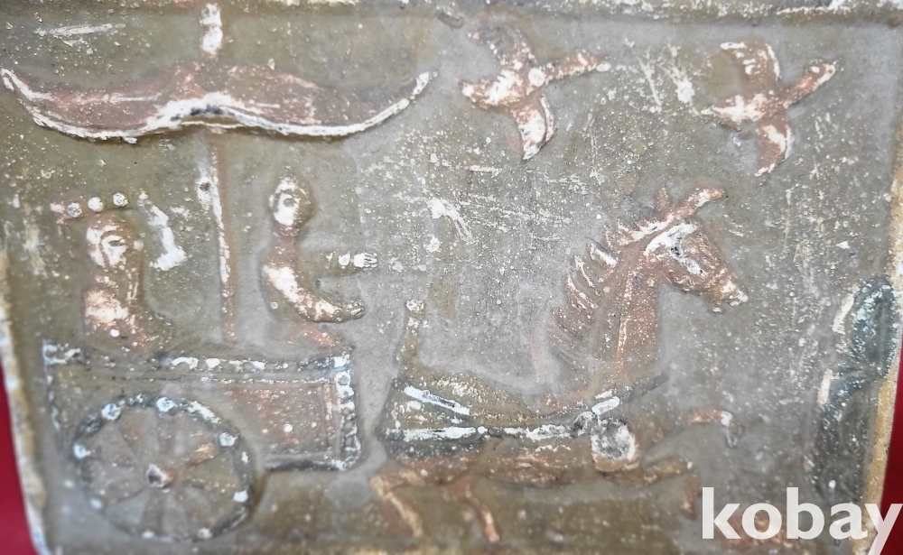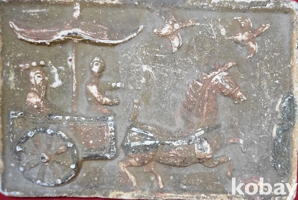짱짱한 연대 갖춘 당채로 마감된 마차와 인물 창공에 날으는 새문양 전돌입니다,