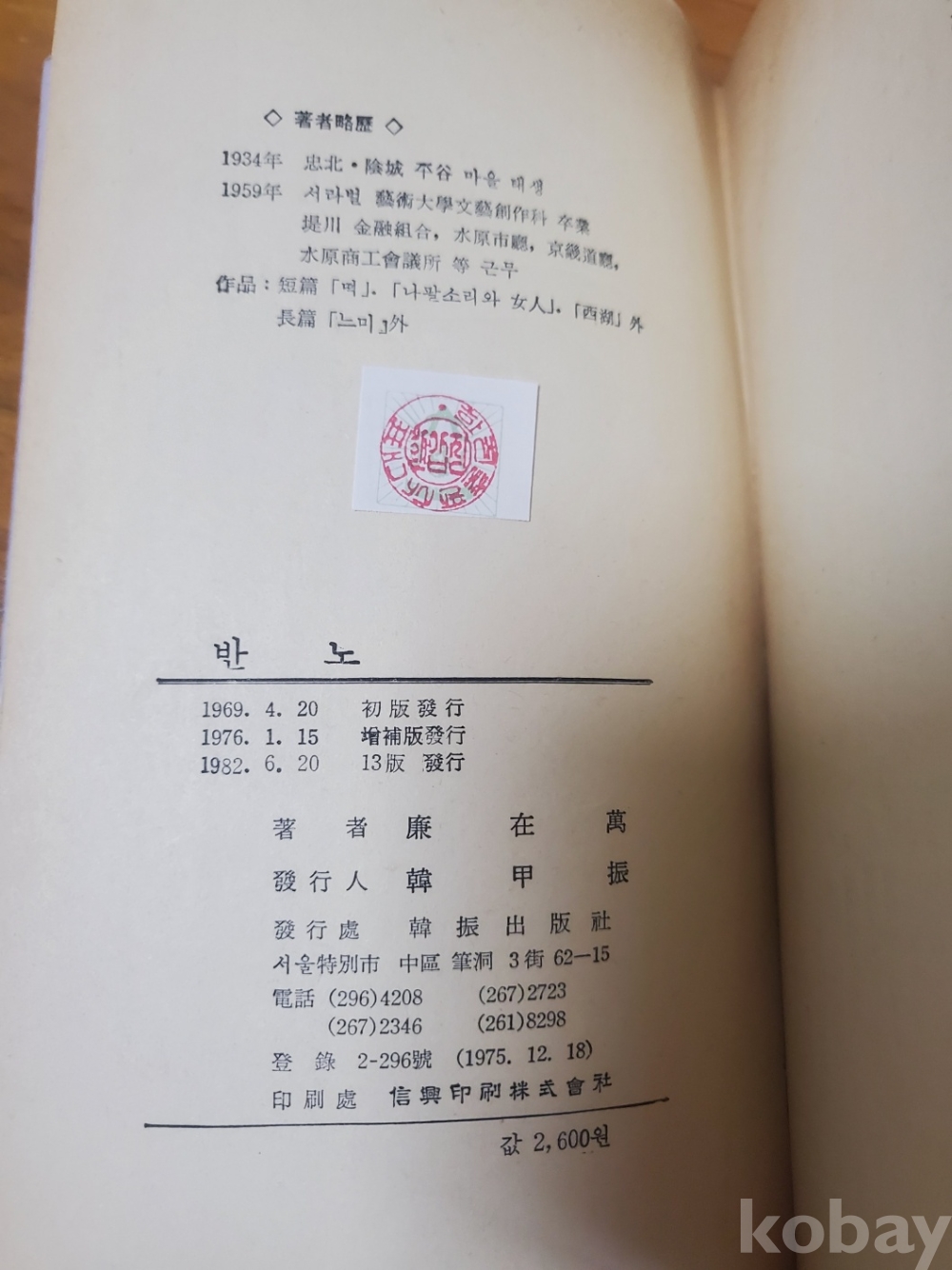 1. 반노, 염재만, 한진출판사, 1982년, 348쪽, 상태 상, 사진 참조
