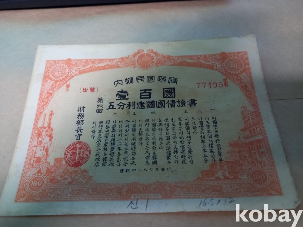 신 1) 대한민국정부 일백원 제6회 오분이건국국채증서