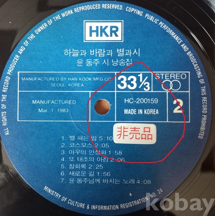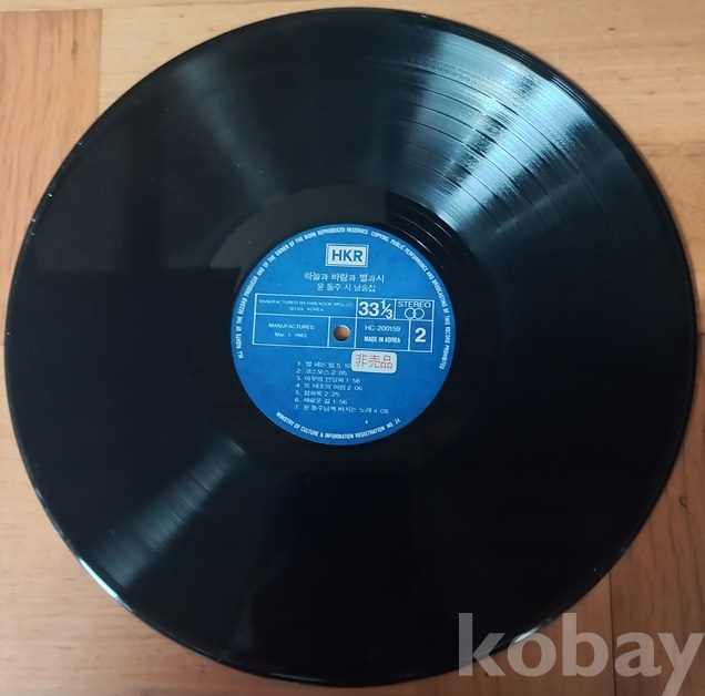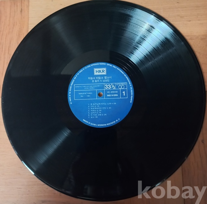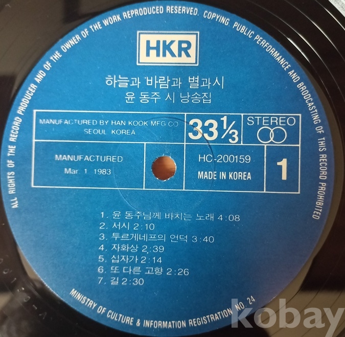 ● 하늘과바람과별과시 시(윤동주 시 낭송집)(윤동주님께 바치는 노래/별 헤는 밤), 한국음반(1983.3.1)STEREO/HC-200159.