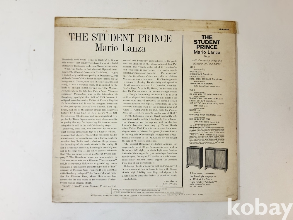 영화, 'The Student Prince'의 주인공, '마리오란자'의 귀에 익은 곡들이 수록된 귀한 음반을 소개합니다.