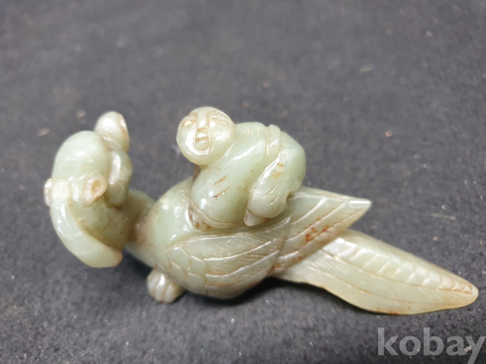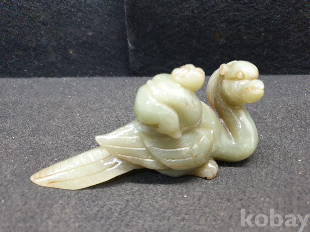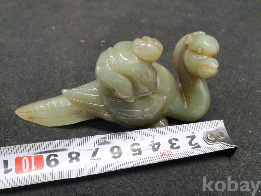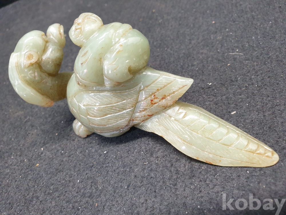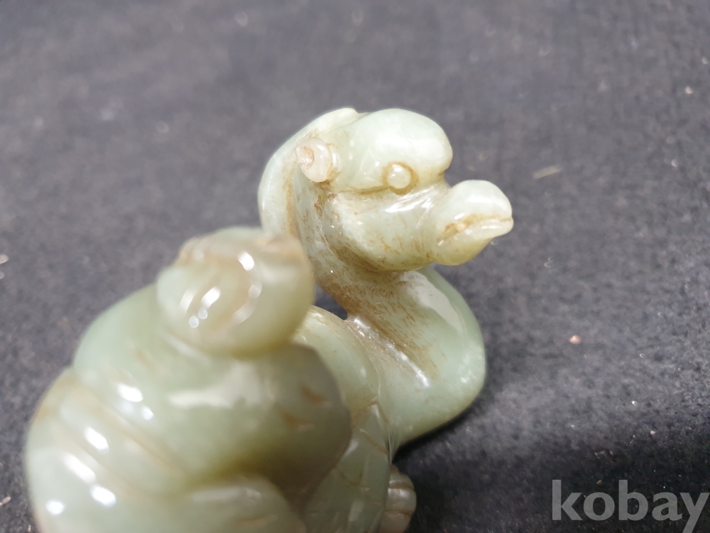 사이즈:.높이:6센치.지름:12센치. 무게:184그람. 설명:통옥으로 된 출토- 춘추전국시기 이쁜 기형의 생동감이 넘치는 투명성이 좋은 깨끗한 재질의 동자를 등에 업고있는 화전옥 중에서도 아주 귀한 청옥 백조상입니다.최대의 사진으로 본 기물의 이쁜 모습 보여드리겠습니다.상태 양호합니다.사진 참고 바랍니다.