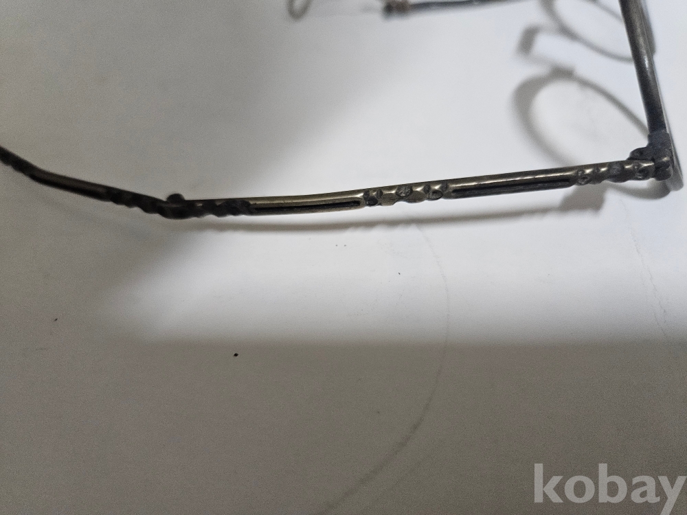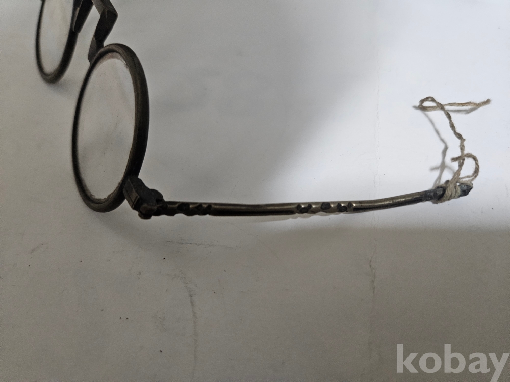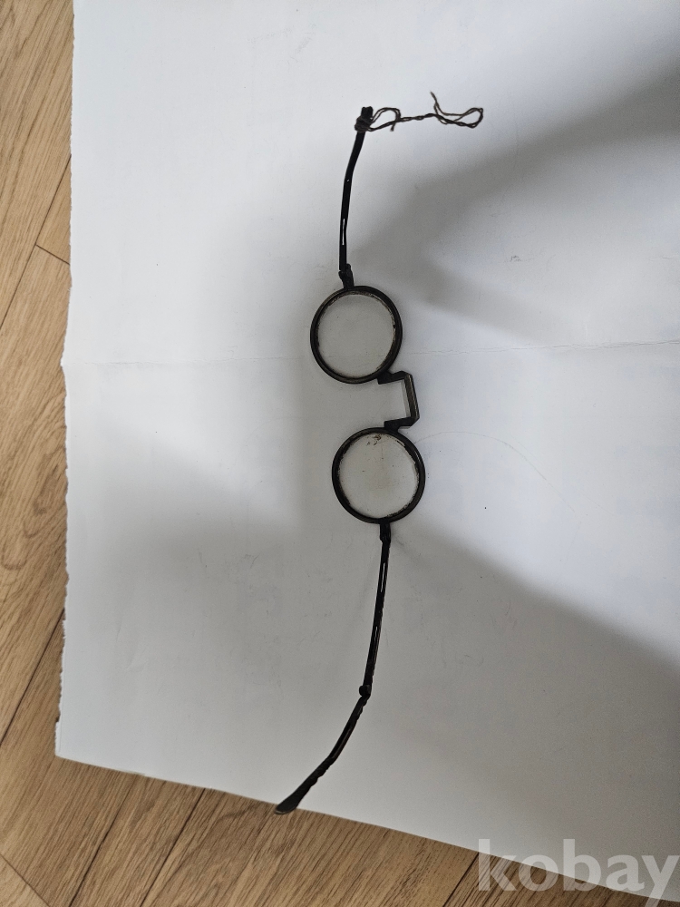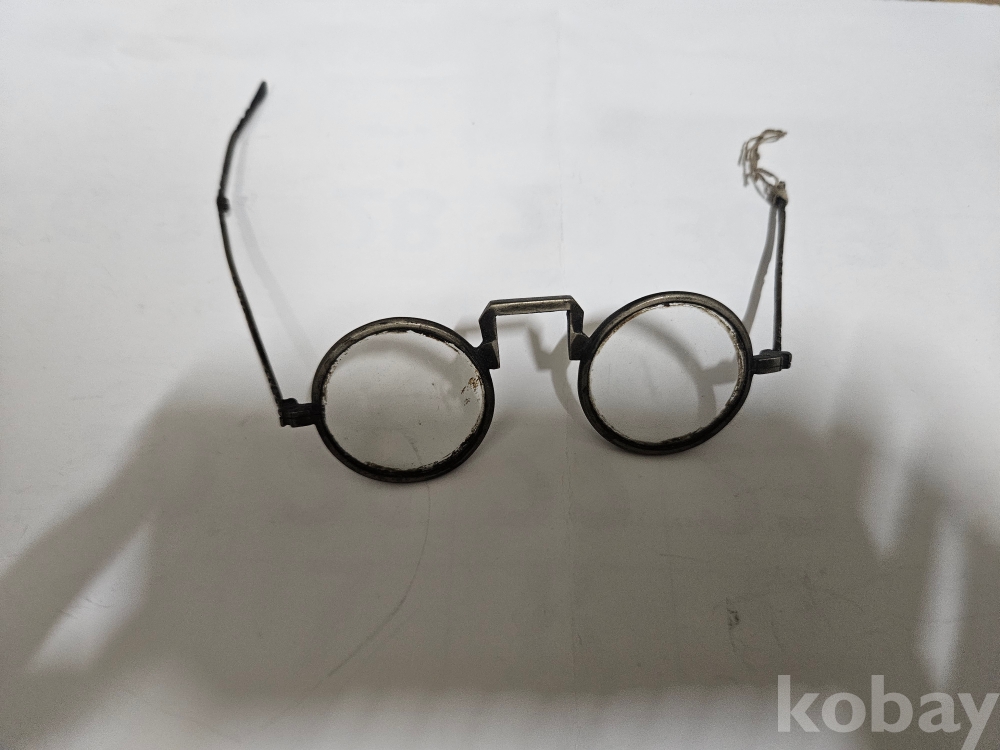 금속(또는 놋쇠) 재질의 프레임에, 당시 제작 방식 특유의 두꺼운 렌즈와 단단한 경첩 구조, 그리고 각진 코받침(노즈 브릿지) 형태가 특징입니다.